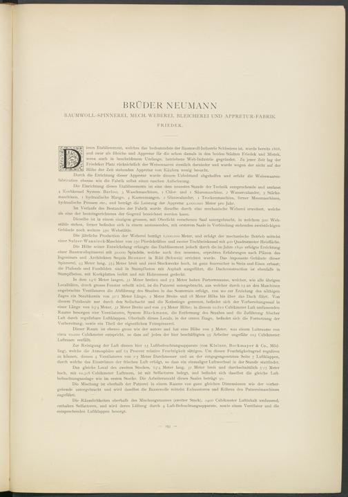 Die Einrichtung dieses Etablissements ist eine dem neuesten Stande der Technik entsprechende und umfasst 4 Kochkessel System Barloo, 3 Waschmaschinen, 1 Chlor- und 1 Säuremaschine, 2 Wassercalander, 5 Stärkemaschinen, 1 hydraulische Mange, 4 Kastenmangen, 2 Glanzcalander, 1 Trockenmaschine, ferner Messmaschinen, hydraulische Pressen etc., und beträgt die Leistung der Appretur 4,000.000 Meter pro Jahr.