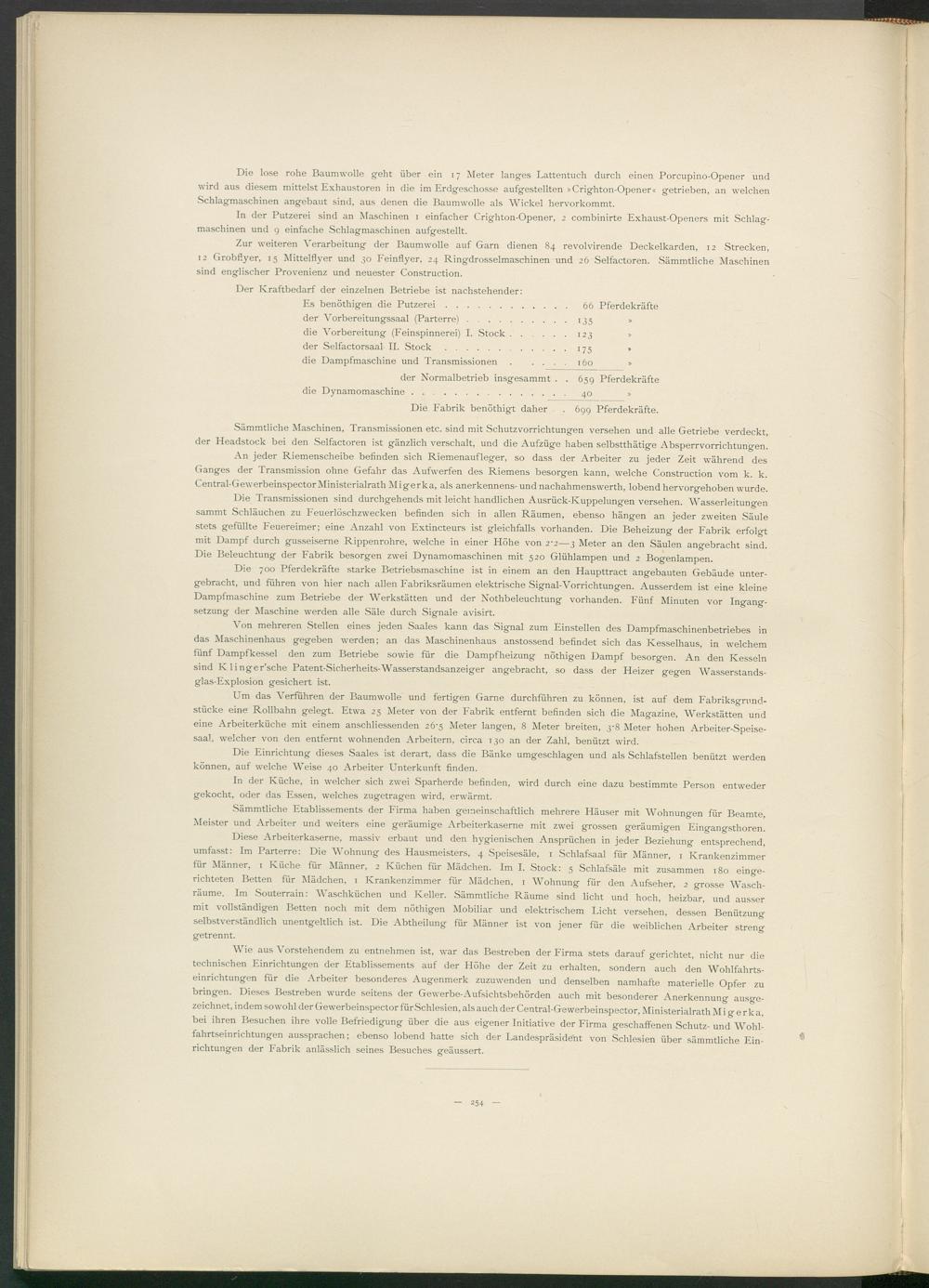 Wie aus Vorstehendem zu entnehmen ist, wmr das Bestreben der Firma stets darauf gerichtet, nicht nur die technischen Einrichtungen der Etablissements auf der Höhe der Zeit zu erhalten, sondern auch den Wohlfahrtseinrichtungen für die Arbeiter besonderes Augenmerk zuzuwenden und denselben namhafte materielle Opfer zu bringen. Dieses Bestreben wurde seitens der Gewerbe-Aufsichtsbehörden auch mit besonderer Anerkennung ausgezeichnet, indem sowohl der Gewerbeinspector für Schlesien, als auch der Central-Gewerbeinspector, Ministerialrath M i g erka, bei ihren Besuchen ihre volle Befriedigung über die aus eigener Initiative der Firma geschaffenen Schutz- und Wohlfahrtseinrichtungen aussprachen; ebenso lobend hatte sich der Landespräside'nt von Schlesien über sämmtliche Einrichtungen der Fabrik anlässlich seines Besuches geäussert.