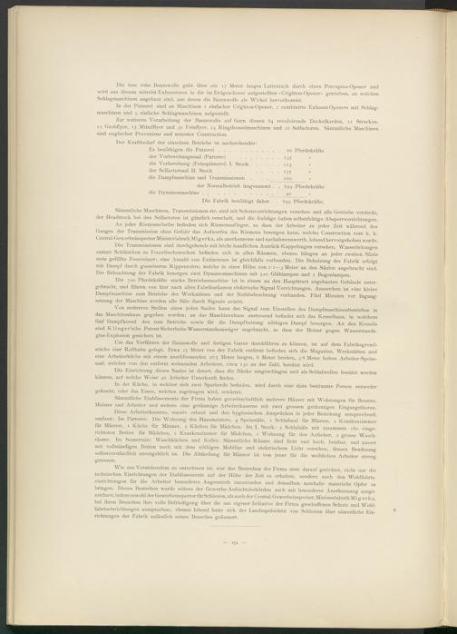 Um das Verführen der Baumwolle und fertigen Garne durchführen zu können, ist auf dem Fabriksgrundstücke eine Rollbahn gelegt. Etwa 25 Meter von der Fabrik entfernt befinden sich die Magazine, Werkstätten und eine Arbeiterküche mit einem anschliessenden 2Ö'5 Meter langen, 8 Meter breiten, 3‘8 Meter hohen Arbeiter-Speisesaal, welcher von den entfernt wohnenden Arbeitern, circa 130 an der Zahl, benützt wird.
