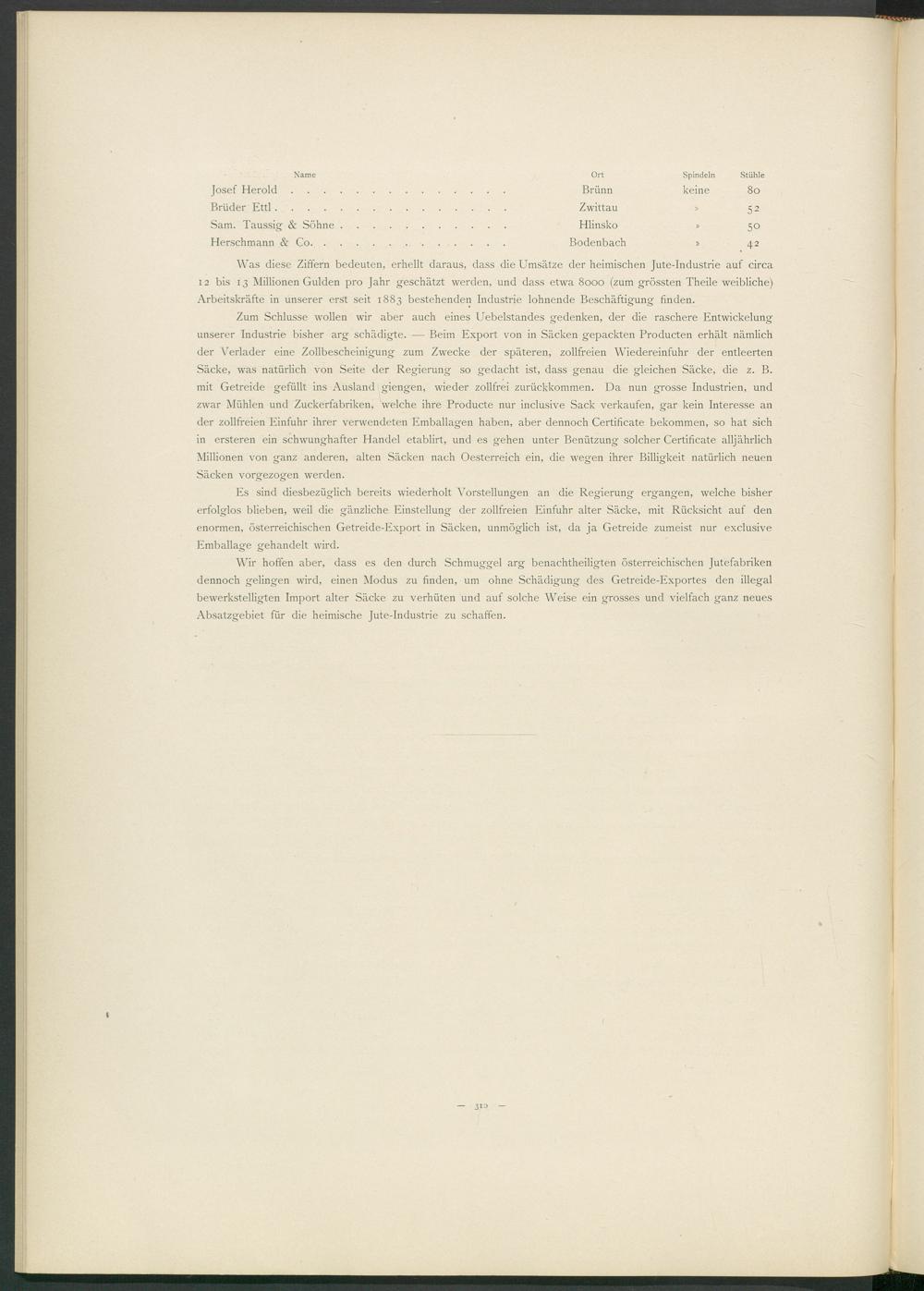 Zum Schlüsse wollen wir aber auch eines Uebelstandes gedenken, der die raschere Entwickelung unserer Industrie bisher arg schädigte. — Beim Export von in Säcken gepackten Producten erhält nämlich der Verlader eine Zollbescheinigung zum Zwecke der späteren, zollfreien Wiedereinfuhr der entleerten Säcke, was natürlich von Seite der Regierung so gedacht ist, dass genau die gleichen Säcke, die z. B. mit Getreide gefüllt ins Ausland giengen, wieder zollfrei zurückkommen. Da nun grosse Industrien, und zwar Mühlen und Zuckerfabriken, welche ihre Producte nur inclusive Sack verkaufen, gar kein Interesse an der zollfreien Einfuhr ihrer verwendeten Emballagen haben, aber dennoch Certificate bekommen, so hat sich in ersteren ein schwunghafter Handel etablirt, und es gehen unter Benützung solcher Certificate alljährlich Millionen von ganz anderen, alten Säcken nach Oesterreich ein, die wegen ihrer Billigkeit natürlich neuen Säcken vorgezogen werden.