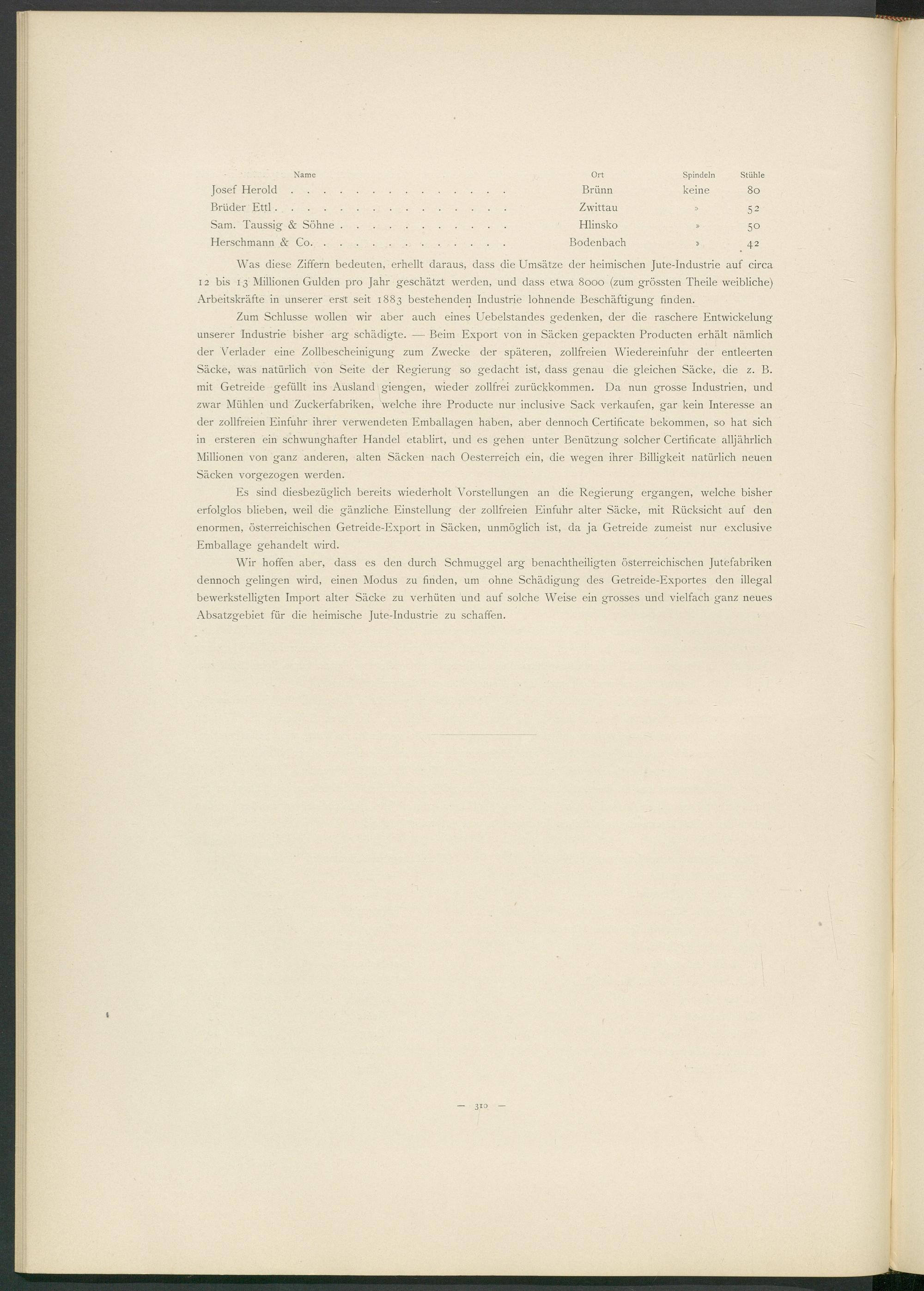 Wir hoffen aber, dass es den durch Schmuggel arg benachtheiligten österreichischen Jutefabriken dennoch gelingen wird, einen Modus zu finden, um ohne Schädigung des Getreide-Exportes den illegal bewerkstelligten Import alter Säcke zu verhüten und auf solche Weise ein grosses und vielfach ganz neues Absatzgebiet für die heimische Jute-Industrie zu schaffen.