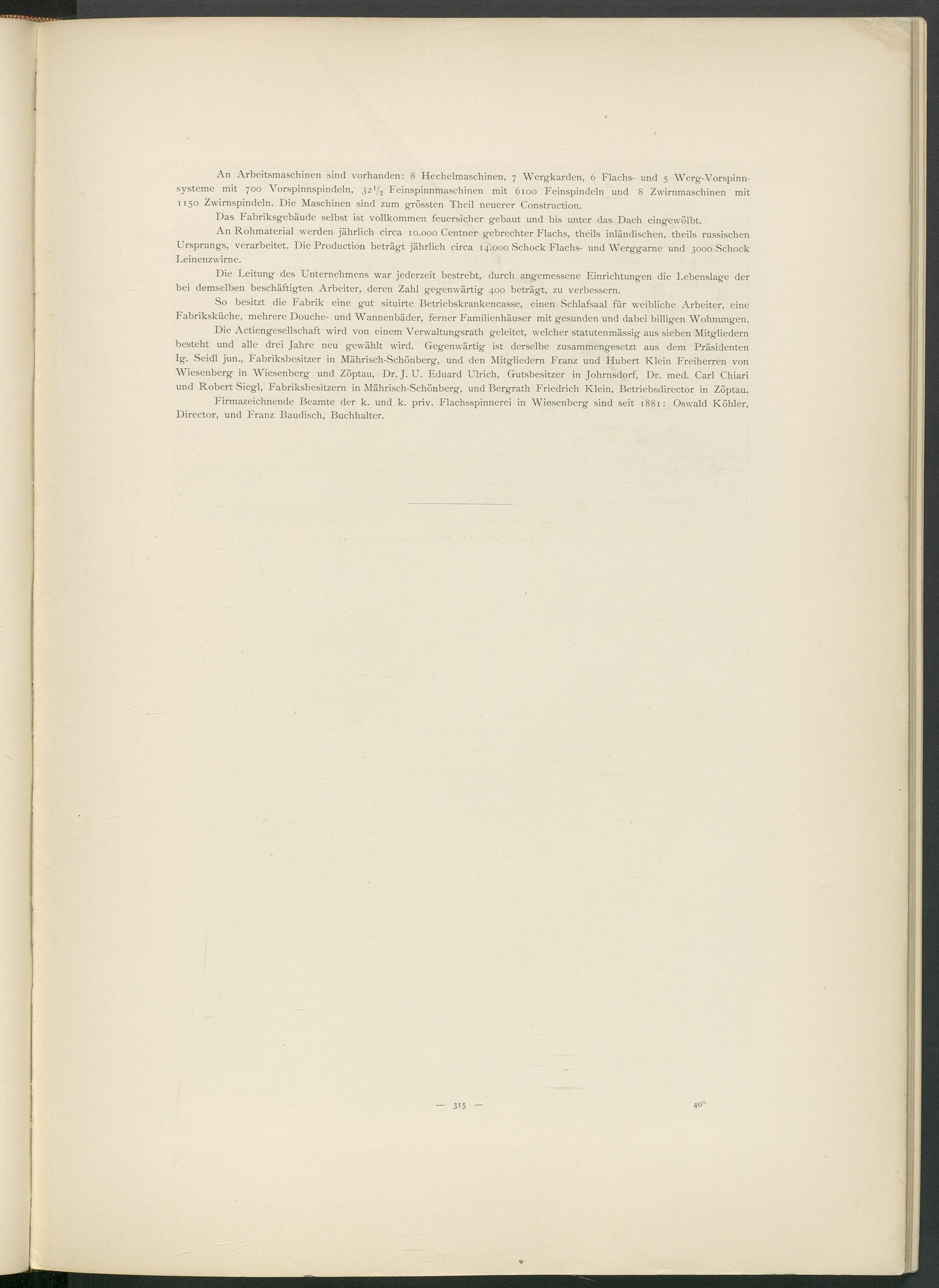 Firmazeichnende Beamte der k. und k. priv. Flachsspinnerei in Wiesenberg sind seit 1881: Oswald Köhler, Director, und Franz Baudisch, Buchhalter.