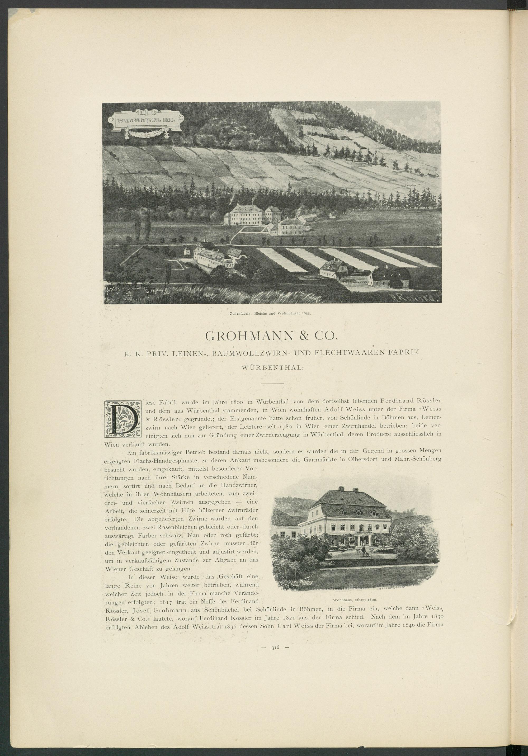 iese Fabrik wurde im Jahre 1800 in Würbenthal von dem dortselbst lebenden Ferdinand Rössler und dem aus Würbenthal stammenden, in Wien wohnhaften Adolf Weiss unter der Firma »Weiss & Rössler« gegründet; der Erstgenannte hatte schon früher, von Schönlinde in Böhmen aus, Leinenzwirn nach Wien geliefert, der Letztere seit 1780 in Wien einen Zwirnhandel betrieben; beide vereinigten sich nun zur Gründung einer Zwirnerzeug-ung in Würbenthal, deren Producte ausschliesslich in Wien verkauft wurden.