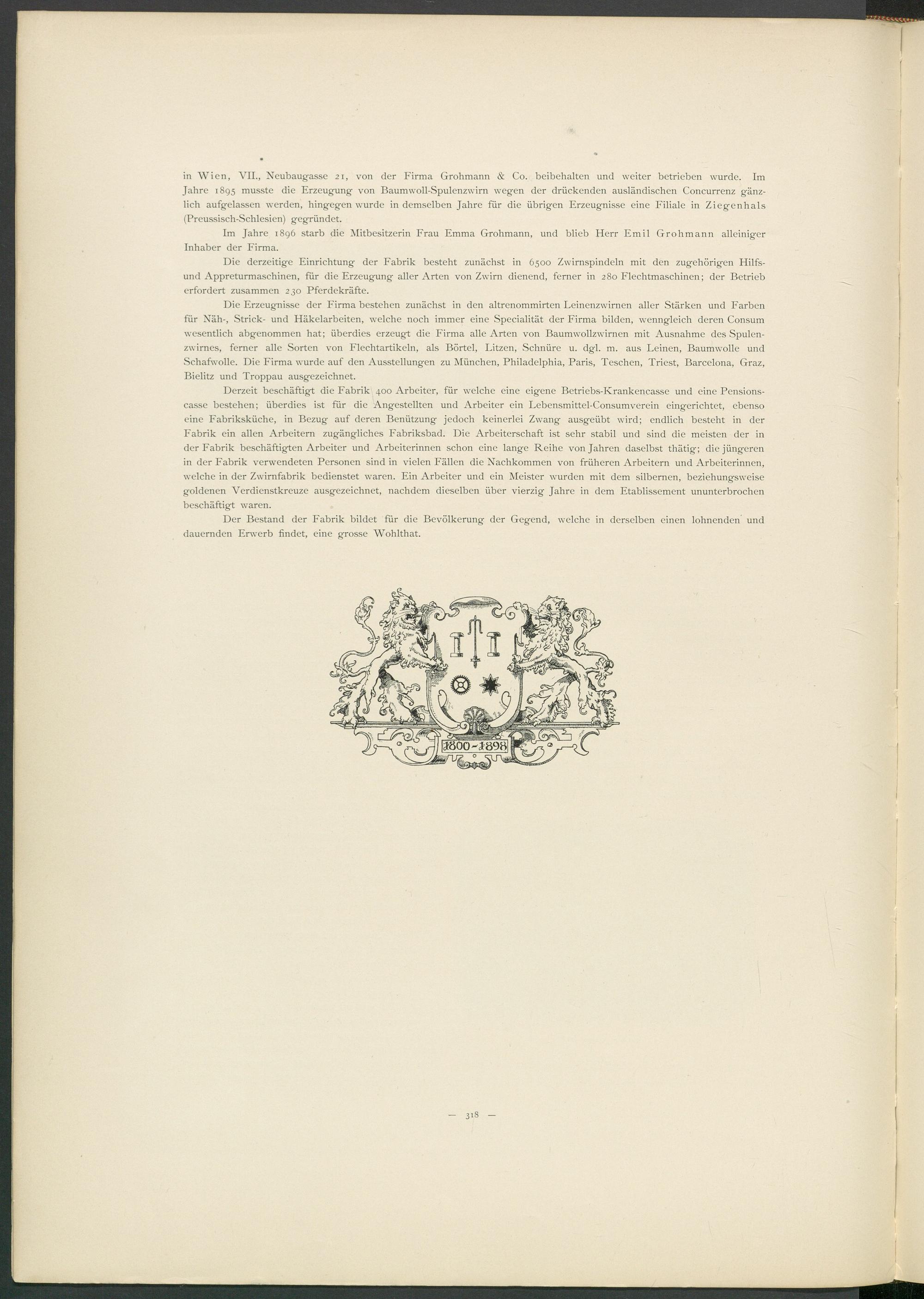 in Wien, VII., Neübaugasse 21, von der Firma Grohmann & Co. beibehalten und weiter betrieben wurde. Im Jahre 1895 musste die Erzeugung- von Baumwoll-Spulenzwirn wegen der drückenden ausländischen Concurrenz g-änz- lich aufgelassen werden, hingegen wurde in demselben Jahre für die übrigen Erzeugnisse eine Filiale in Ziegenhals (Preussisch-Schlesien) gegründet.
