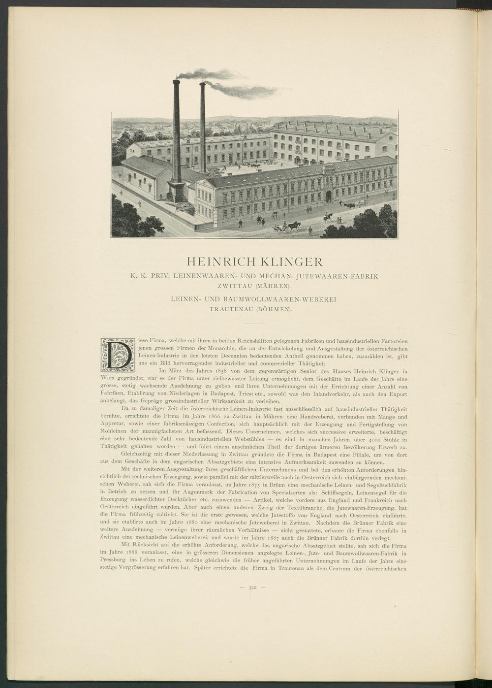 Im März des Jahres 1858 von dem gegenwärtigen Senior des Hauses Heinrich Klinger in Wien gegründet, war es der Firma unter zielbewusster Leitung ermöglicht, dem Geschäfte im Laufe der Jahre eine grosse, stetig wachsende Ausdehnung zu geben und ihren Unternehmungen mit der Errichtung einer Anzahl von Fabriken, Etablirung von Niederlagen in Budapest, Triest etc., sowohl was den Inlandverkehr, als auch den Export anbelangt, das Gepräge grossindustrieller Wirksamkeit zu verleihen.