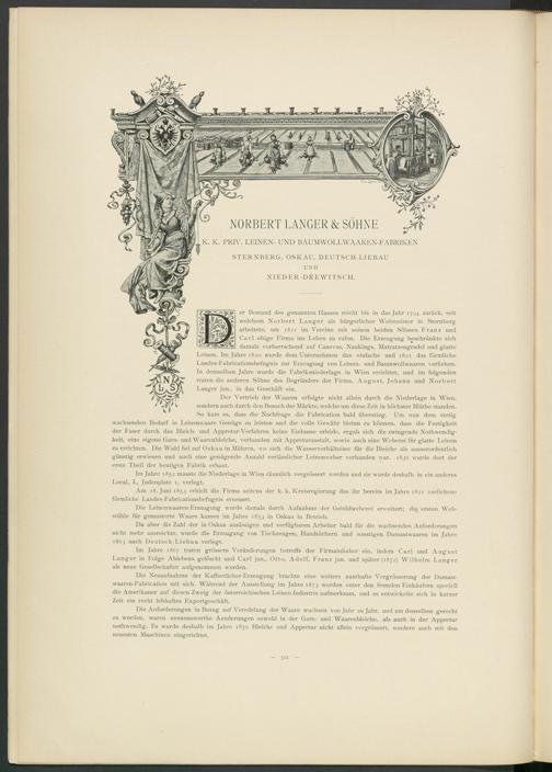 er Bestand des genannten Hauses reicht bis in das Jahr 1794 zurück, seit welchem Norbert Langer als bürgerlicher Webmeister in Sternberg arbeitete, um 1821 im Vereine mit seinen beiden Söhnen Franz und Carl obige Firma ins Leben zu rufen. Die Erzeugung beschränkte sich damals vorherrschend auf Canevas, Nankings, Matratzengradel und glatte Leinen. Im Jahre 1820 wurde dem Unternehmen das einfache und 1821 das förmliche Landes-Fabricationsbefugnis zur Erzeugung von Leinen- und Baumwollwaaren verliehen. In demselben Jahre wurde die Fabriksniederlage in Wien errichtet, und im folgenden traten die anderen Söhne des Begründers der Firma, August, Johann und Norbert Langer jun., in das Geschäft ein.