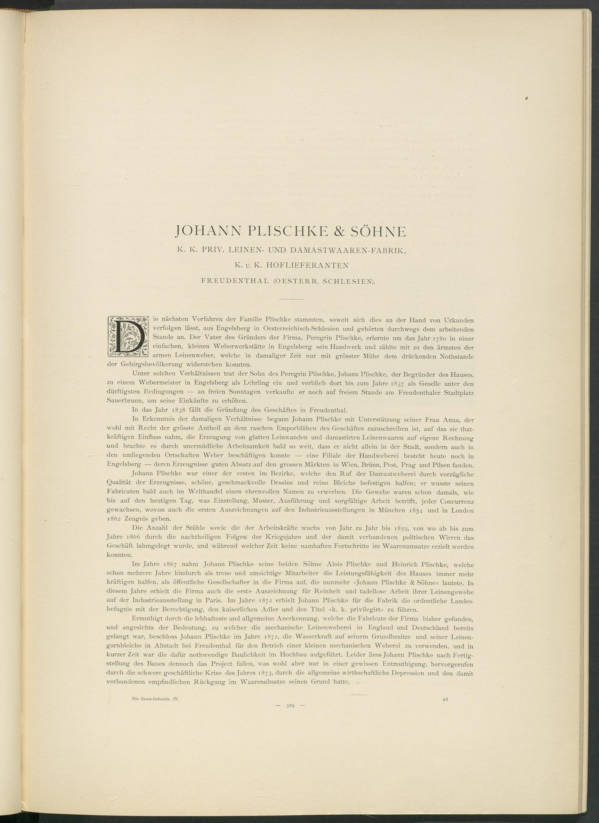 In Erkenntnis der damaligen Verhältnisse begann Johann Plischke mit Unterstützung seiner Frau Anna, der wohl mit Recht der grösste Antheil an dem raschen Emporblühen des Geschäftes zuzuschreiben ist, auf das sie that- kräftigen Einfluss nahm, die Erzeugung von glatten Leinwänden und damastirten Leinenwaaren auf eigene Rechnung und brachte es durch unermüdliche Arbeitsamkeit bald so weit, dass er nicht allein in der Stadt, sondern auch in den umliegenden Ortschaften Weber beschäftigen konnte — eine Filiale der Handweberei besteht heute noch in Engelsberg — deren Erzeugnisse guten Absatz auf den grossen Märkten in Wien, Brünn, Pest, Prag und Pilsen fanden.