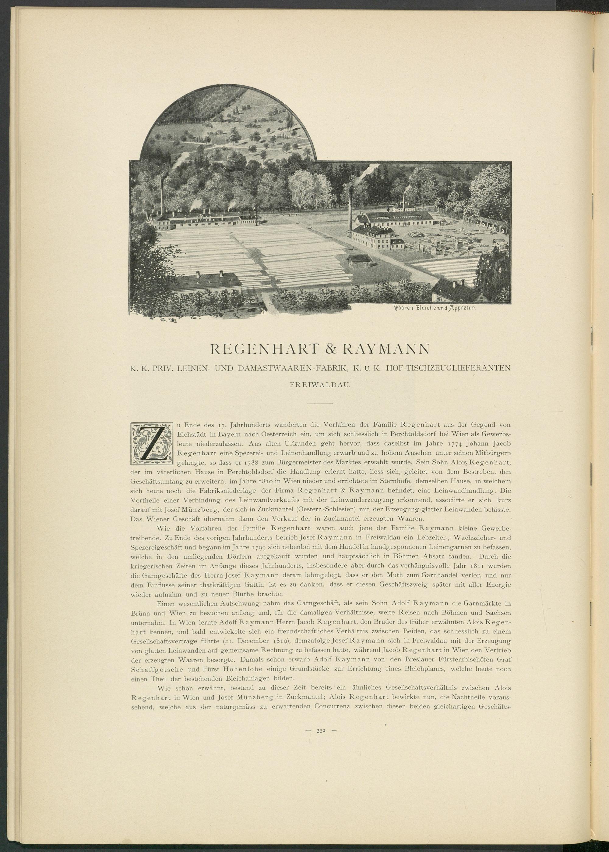 u Ende des 17. Jahrhunderts wanderten die Vorfahren der Familie Regenhart aus der Gegend von Eichstädt in Bayern nach Oesterreich ein, um sich schliesslich in Perchtoldsdorf bei Wien als Gewerbs- leute niederzulassen. Aus alten Urkunden geht hervor, dass daselbst im Jahre 1774 Johann Jacob Regenhart eine Spezerei- und Leinenhandlung erwarb und zu hohem Ansehen unter seinen Mitbürgern gelangte, so dass er 1788 zum Bürgermeister des Marktes erwählt wurde. Sein Sohn Alois Regenhart, der im väterlichen Hause in Perchtoldsdorf die Handlung erlernt hatte, liess sich, geleitet von dem Bestreben, den Geschäftsumfang zu erweitern, im Jahre 1810 in Wien nieder und errichtete im Sternhofe, demselben Hause, in welchem sich heute noch die Fabriksniederlage der Firma Regenhart & Raymann befindet, eine Leinwandhandlung. Die Vortheile einer Verbindung des Leinwandverkaufes mit der Leinwanderzeugung erkennend, associirte er sich kurz darauf mit Josef Münzberg, der sich in Zuckmantel (Oesterr.-Schlesien) mit der Erzeugung glatter Leinwänden befasste. Das Wiener Geschäft übernahm dann den Verkauf der in Zuckmantel erzeugten Waaren.