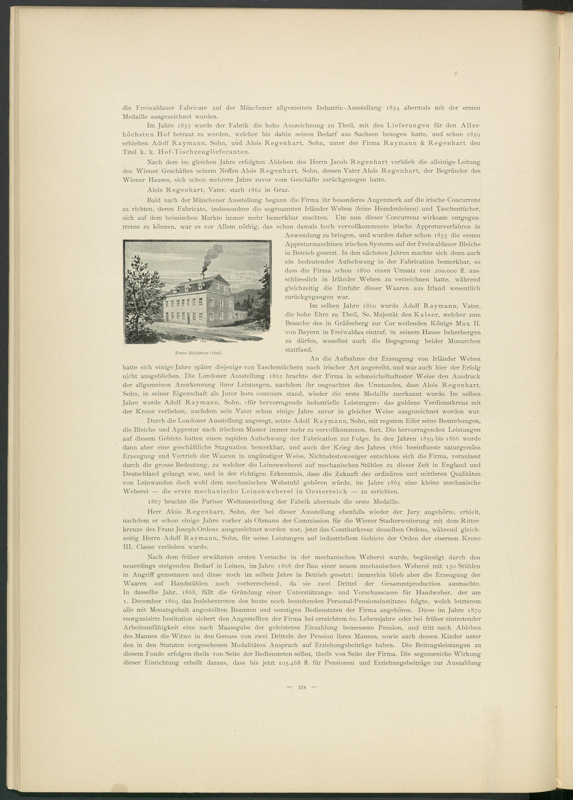 An die Aufnahme der Erzeugung von Irländer Weben hatte sich einige Jahre später diejenige von Taschentüchern nach irischer Art angereiht, und war auch hier der Erfolg nicht ausgeblieben. Die Londoner Ausstellung 1862 brachte der Firma in schmeichelhaftester Weise den Ausdruck der allgemeinen Anerkennung ihrer Leistungen, nachdem ihr ungeachtet des Umstandes, dass Alois Regenhart, Sohn, in seiner Eigenschaft als Juror hors concours stand, wieder die erste Medaille zuerkannt wurde. Im selben Jahre wurde Adolf Raymann, Sohn, »für hervorragende industrielle Leistungen« das goldene Verdienstkreuz mit der Krone verliehen, nachdem sein Vater schon einige Jahre zuvor in gleicher Weise ausgezeichnet worden war.