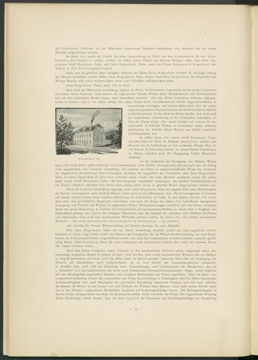 Herr Alois Regenhart, Sohn, der bei dieser Ausstellung ebenfalls wieder der Jury angehörte, erhielt, nachdem er schon einige Jahre vorher als Obmann der Commission für die Wiener Stadterweiterung mit dem Ritterkreuze des Franz Joseph-Ordens ausgezeichnet worden war, jetzt das Comthurkreuz desselben Ordens, während gleichzeitig Herrn Adolf Raymann, Sohn, für seine Leistungen auf industriellem Gebiete der Orden der eisernen Krone III. Classe verliehen wurde.