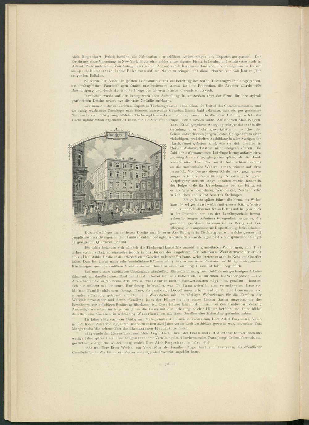 1887 trat'Herr Ernst Weiss, ein Wrwandter der Familien Regenhart und Raymann, als öffentlicher Gesellschafter in die Firma ein, der-er seit 1877 als Procurist angehört hatte.