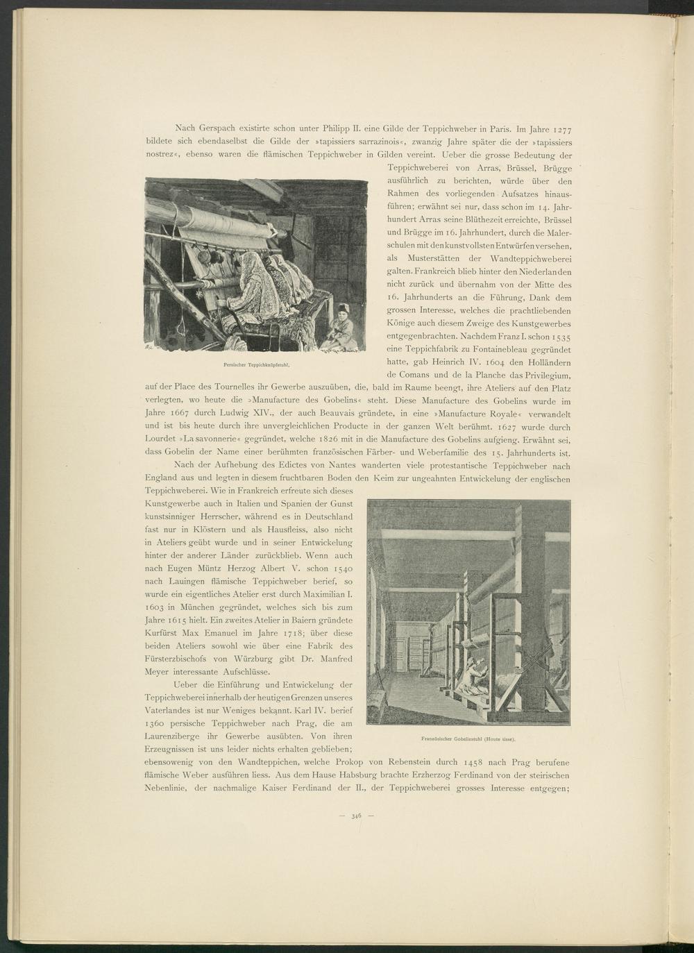 Nach Gerspach existirte schon unter Philipp II. eine Gilde der Teppichweber in Paris. Im Jahre 1277 bildete sich ebendaselbst die Gilde der »tapissiers sarrazinois«, zwanzig Jahre später die der »tapissiers nostrez«, ebenso waren die flämischen Teppichweber in Gilden vereint. Ueber die grosse Bedeutung der
