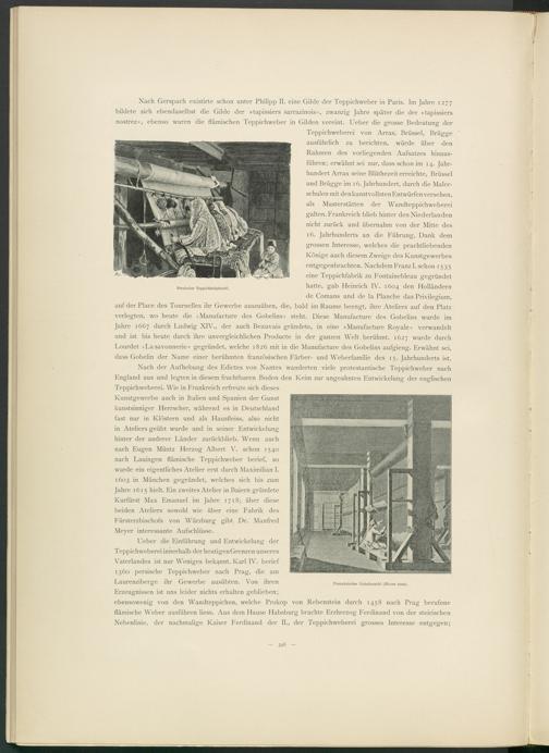 Teppichweberei von Arras, Brüssel, Brügge ausführlich zu berichten, würde über den Rahmen des vorliegenden Aufsatzes hinausführen; erwähnt sei nur, dass schon im 14. Jahrhundert Arras seine Blüthezeit erreichte, Brüssel und Brügge im 16. Jahrhundert, durch die Malerschulen mit den kunstvollsten Entwürfen versehen, als Musterstätten der Wandteppichweberei galten. Frankreich blieb hinter den Niederlanden nicht zurück und übernahm von der Mitte des 16. Jahrhunderts an die Führung, Dank dem grossen Interesse, welches die prachtliebenden Könige auch diesem Zweige des Kunstgewerbes entgegenbrachten. Nachdem Franzi, schon 1535 eine Teppichfabrik zu Fontainebleau gegründet hatte, gab Heinrich IV. 1604 den Holländern de Comans und de la Planche das Privilegium, auf der Place des Tournelles ihr Gewerbe auszuüben, die, bald im Raume beengt, ihre Ateliers' auf den Platz verlegten, wo heute die »Manufacture des Gobelins« steht. Diese Manufacture des Gobelins wurde im Jahre 1667 durch Ludwig XIV., der auch Beauvais gründete, in eine »Manufacture Royale« verwandelt und ist bis heute durch ihre unvergleichlichen Producte in der ganzen Welt berühmt. 1627 wurde durch Lourdet »Lasavonnerie« gegründet, welche 1826 mit in die Manufacture des Gobelins aufgieng. Erwähnt sei, dass Gobelin der Name einer berühmten französischen Färber- und Weberfamilie des ^.Jahrhunderts ist.