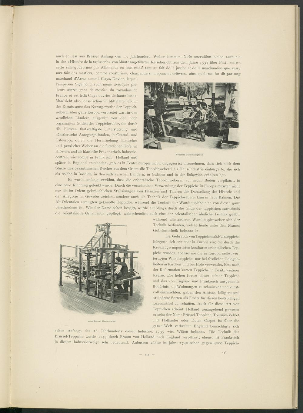 DerGebrauch vonTeppichen alsFussteppiche bürgerte sich erst spät in Europa ein; die durch die Kreuzzüge importirten kostbaren orientalischen Teppiche wurden, ebenso wie die in Europa selbst verfertigten Wandteppiche, nur bei festlichen Gelegenheiten in Kirchen und bei Hofe verwendet. Erst nach der Reformation kamen Teppiche in Besitz weiterer Kreise. Die hohen Preise dieser echten Teppiche und das von England und Frankreich ausgehende Bedürfnis, die Wohnungen zu schmücken und kunstvoll einzurichten, gaben den Anstoss, billigere und ordinärere Sorten als Ersatz für diesen kostspieligen Luxusartikel zu schaffen. Auch für diese Art von Teppichen scheint Holland tonangebend gewesen zu sein; der Name Brüssel-Teppiche, Tournay-Velvet und Holländer oder Dutch Carpet ist über die ganze Welt verbreitet. England bemächtigte sich schon Anfangs des 18. Jahrhunderts dieser Industrie, 1735 wird Wilton bekannt. Die Technik der Brüssel-Teppiche wurde 1749 durch Broom von Holland nach England verpflanzt; ebenso ist Frankreich in diesem Industriezweige sehr bedeutend. Aubusson zählte im Jahre 1740 schon gegen 4000 Teppich-