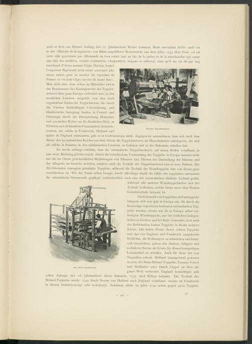 Man sieht also, dass schon im Mittelalter und in der Renaissance das Kunstgewerbe der Teppichweberei über ganz Europa verbreitet war, in den westlichen Ländern ausgeübt von den hoch organisirten Gilden der Teppichweber, die durch die Fürsten thatkräftigste Unterstützung und künstlerische Anregung fanden, in Central- und Osteuropa durch die Heranziehung flämischer und persischer Weber an die fürstlichen Höfe, in Klöstern und als häusliche Frauenarbeit. Industrie- centren, wie solche in Frankreich, Holland und später in England entstanden, gab es in Centraleuropa nicht, dagegen ist anzunehmen, dass sich nach dem Sturze des byzantinischen Reiches aus dem Orient die Teppichweberei als Haus-Industrie einbürgerte, die sich als solche in Bosnien, in den südslavischen Ländern, in Galizien und in der Bukowina erhalten hat.