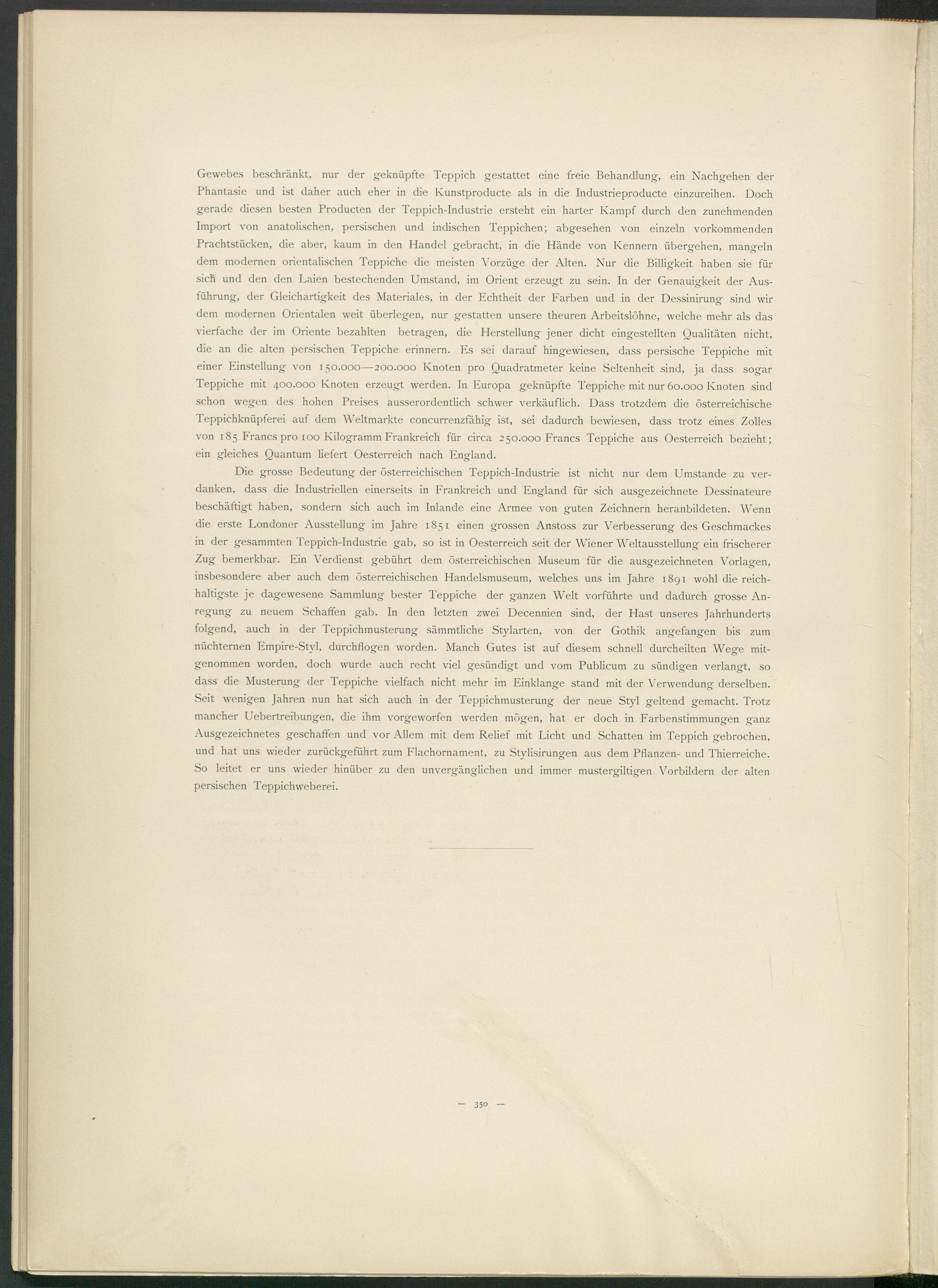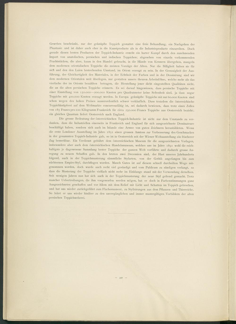 Gewebes beschränkt, nur der geknüpfte Teppich gestattet eine freie Behandlung, ein Nachgehen der Phantasie und ist daher auch eher in die Ivunstproducte als in die Industrieproducte einzureihen. Doch gerade diesen besten Producten der Teppich-Industrie ersteht ein harter Kampf durch den zunehmenden Import von anatolischen, persischen und indischen Teppichen; abgesehen von einzeln vorkommenden Prachtstücken, die aber, kaum in den Handel gebracht, in die Hände von Kennern übergehen, mangeln dem modernen orientalischen Teppiche die meisten Vorzüge der Alten. Nur die Billigkeit haben sie für sich und den den Laien bestechenden Umstand, im Orient erzeugt zu sein. In der Genauigkeit der Ausführung, der Gleichartigkeit des Materiales, in der Echtheit der Farben und in der Dessinirung sind wir dem modernen Orientalen weit überlegen, nur gestatten unsere theuren Arbeitslöhne, welche mehr als das vierfache der im Oriente bezahlten betragen, die Herstellung jener dicht eingestellten Qualitäten nicht, die an die alten persischen Teppiche erinnern. Es sei darauf hingewiesen, dass persische Teppiche mit einer Einstellung von 150.000—200.000 Knoten pro Quadratmeter keine Seltenheit sind, ja dass sogar Teppiche mit 400.000 Knoten erzeugt werden. In Europa geknüpfte Teppiche mit nur 60.000 Knoten sind schon wegen des hohen Preises ausserordentlich schwer verkäuflich. Dass trotzdem die österreichische Teppichknüpferei auf dem Weltmärkte concurrenzfähig ist, sei dadurch bewiesen, dass trotz eines Zolles von 185 Francs pro 100 Kilogramm Frankreich für circa 250.000 Francs Teppiche aus Oesterreich bezieht; ein gleiches Quantum liefert Oesterreich nach England.
