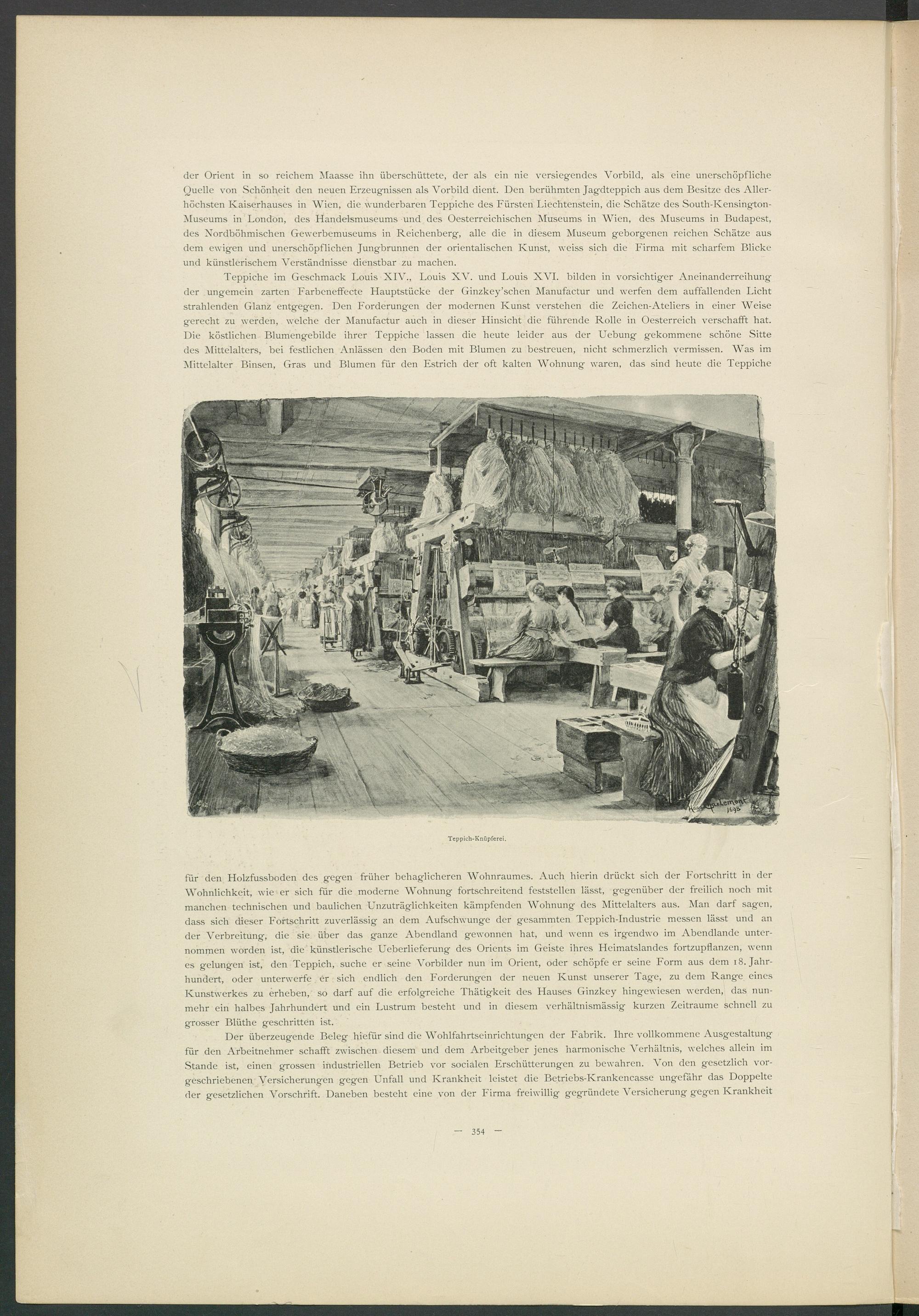 für den Holzfussboden des gegen früher behaglicheren Wohnraumes. Auch hierin drückt sich der Fortschritt in der Wohnlichkeit, wie er sich für die moderne Wohnung fortschreitend feststellen lässt, gegenüber der freilich noch mit manchen technischen und baulichen Unzuträglichkeiten kämpfenden Wohnung des Mittelalters aus. Man darf sagen, dass sich dieser Fortschritt zuverlässig an dem Aufschwünge der gesammten Teppich-Industrie messen lässt und an der Verbreitung, die sie über das ganze Abendland gewonnen hat, und wenn es irgendwo im Abendlande unternommen worden ist, die künstlerische Ueberlieferung des Orients im Geiste ihres Heimatslandes fortzupflanzen, wenn es gelungen ist, den Teppich, suche er seine Vorbilder nun im Orient, oder schöpfe er seine Form aus dem 18. Jahrhundert, oder unterwerfe er sich endlich den Forderungen der neuen Kunst unserer Tage, zu dem Range eines Kunstwerkes zu erheben, so darf auf die erfolgreiche Thätigkeit des Hauses Ginzkey hingewiesen werden, das nunmehr ein halbes Jahrhundert und ein Lustrum besteht und in diesem verhältnismässig kurzen Zeiträume schnell zu grosser Blüthe geschritten ist.