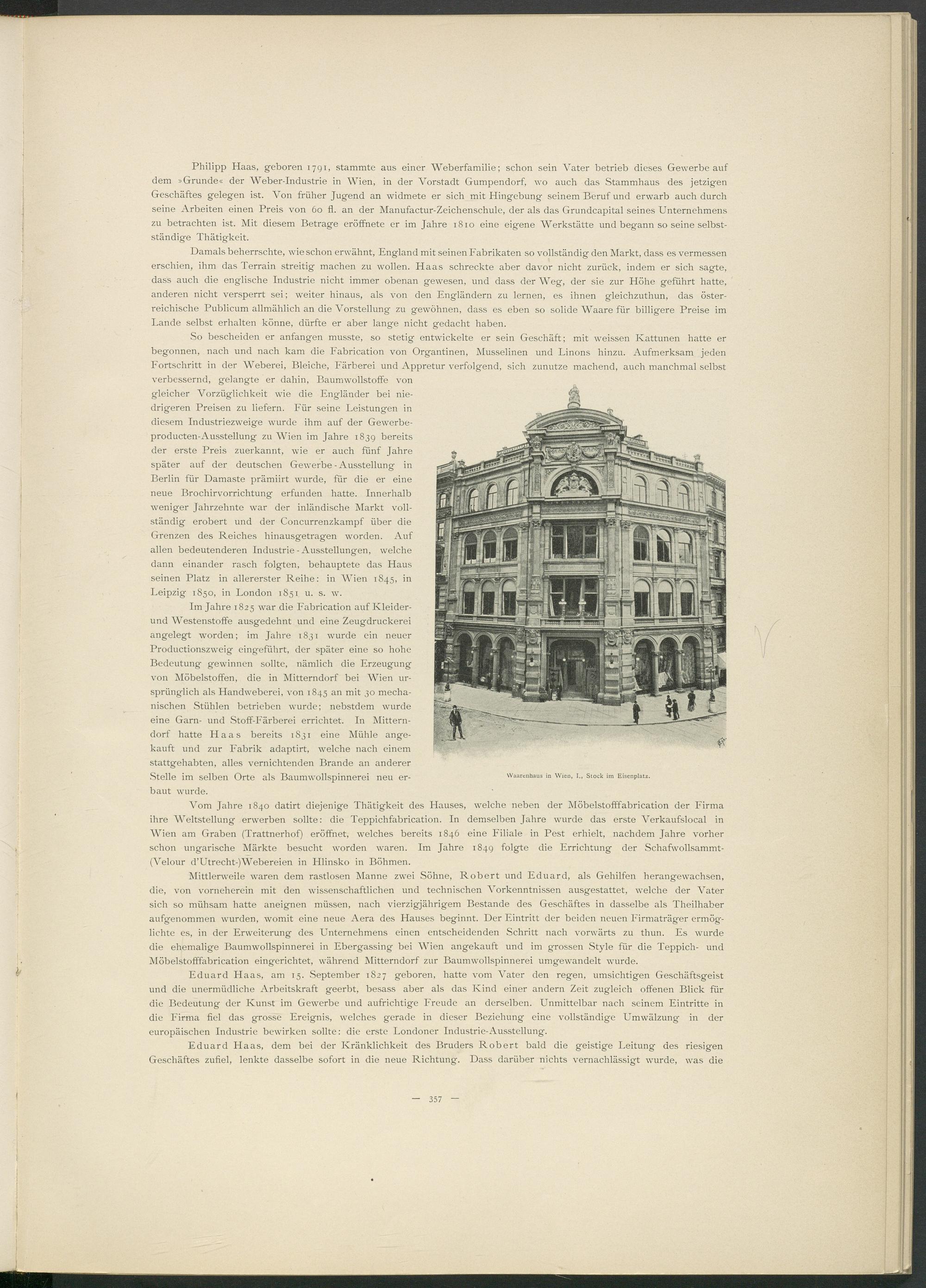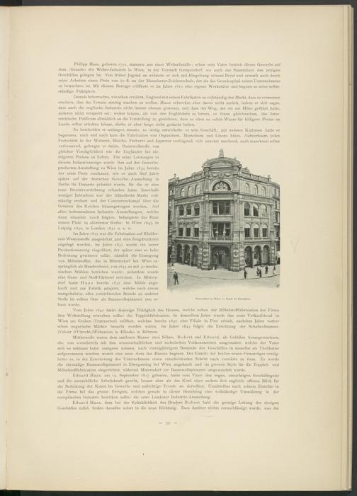 Philipp Haas, geboren 1791, stammte aus einer AVeberfamilie; schon sein Vater betrieb dieses Gewerbe auf dem »Grunde« der AVeber-Industrie in AAhen, in der A^orstadt Gumpendorf, wo auch das Stammhaus des jetzigen Geschäftes gelegen ist. A"on früher Jugend an widmete er sich mit Hingebung seinem Beruf und erwarb auch durch seine Arbeiten einen Preis von 60 fl. an der Manufactur-Zeichenschule, der als das Grundcapital seines Unternehmens zu betrachten ist. Mit diesem Betrage eröffnete er im Jahre 1810 eine eigene A\ r erkstätte und begann so seine selbstständige Thätigkeit.