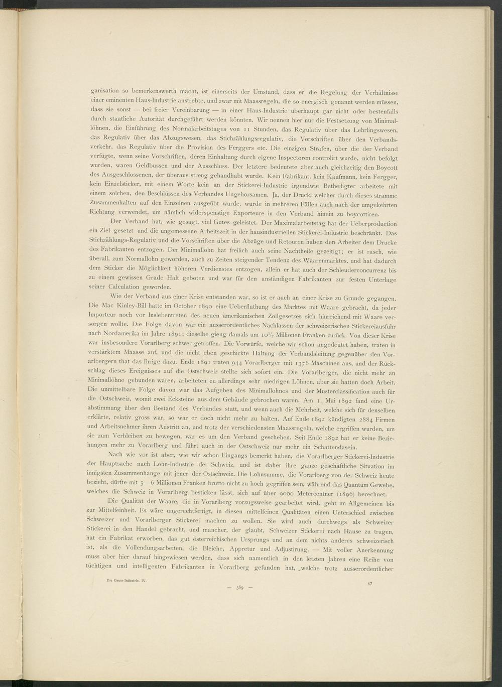Nach wie vor ist aber, wie wir schon Eingangs bemerkt haben, die Vorarlberger Stickerei-Industrie der Hauptsache nach Lohn-Industrie der Schweiz, und ist daher ihre ganze geschäftliche Situation im innigsten Zusammenhänge mit jener der Ostschweiz. Die Lohnsumme, die Vorarlberg von der Schweiz heute bezieht, dürfte mit 5—6 Millionen Franken brutto nicht zu hoch gegriffen sein, während das Quantum Gewebe, welches die Schweiz in Vorarlberg besticken lässt, sich auf über 9000 Metercentner (1896) berechnet.