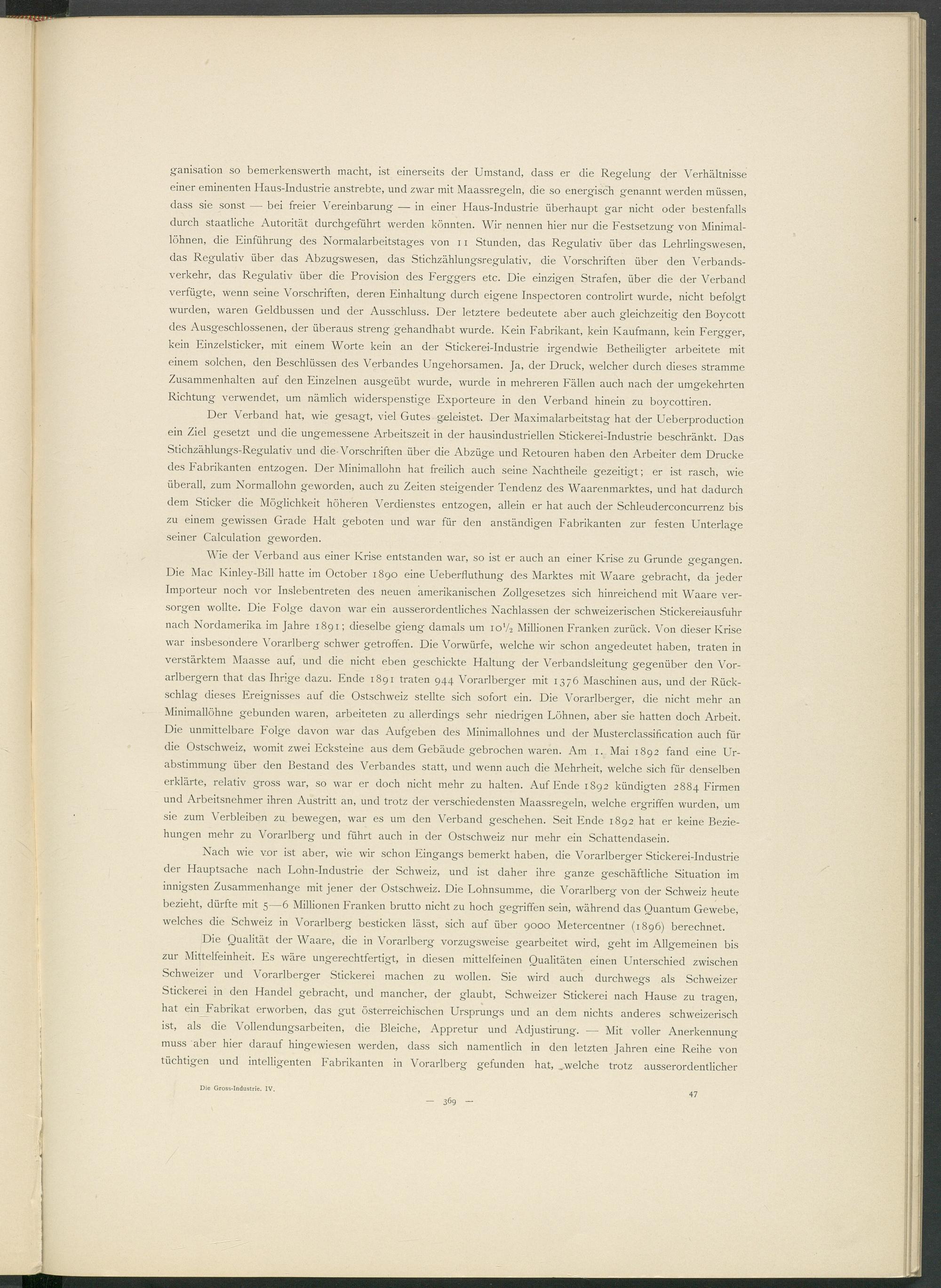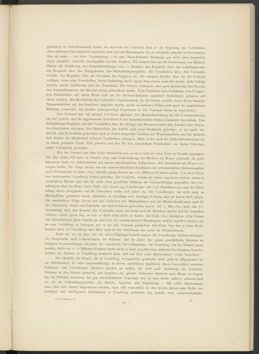 ganisation so bemerkenswerth macht, ist einerseits der Umstand, dass er die Regelung der Verhältnisse einer eminenten Haus-Industrie anstrebte, und zwar mit Maassregeln, die so energisch genannt werden müssen, dass sie sonst — bei freier Vereinbarung — in einer Haus-Industrie überhaupt gar nicht oder bestenfalls durch staatliche Autorität durchgeführt werden könnten. Wir nennen hier nur die Festsetzung von Minimallöhnen, die Einführung des Normalarbeitstages von 11 Stunden, das Regulativ über das Lehrlingswesen, das Regulativ über das Abzugswesen, das Stichzählungsregulativ, die Vorschriften über den Verbandsverkehr, das Regulativ über die Provision des Ferggers etc. Die einzigen Strafen, über die der Verband verfügte, wenn seine Vorschriften, deren Einhaltung durch eigene Inspectoren controlirt wurde, nicht befolgt wurden, waren Geldbussen und der Ausschluss. Der letztere bedeutete aber auch gleichzeitig den Boycott des Ausgeschlossenen, der überaus streng gehandhabt wurde. Kein Fabrikant, kein Kaufmann, kein Fergger, kein Einzelsticker, mit einem Worte kein an der Stickerei-Industrie irgendwie Betheiligter arbeitete mit einem solchen, den Beschlüssen des Verbandes Ungehorsamen. Ja, der Druck, welcher durch dieses stramme Zusammenhalten auf den Einzelnen ausgeübt wurde, wurde in mehreren Fällen auch nach der umgekehrten Richtung verwendet, um nämlich widerspenstige Exporteure in den Verband hinein zu boycottiren.