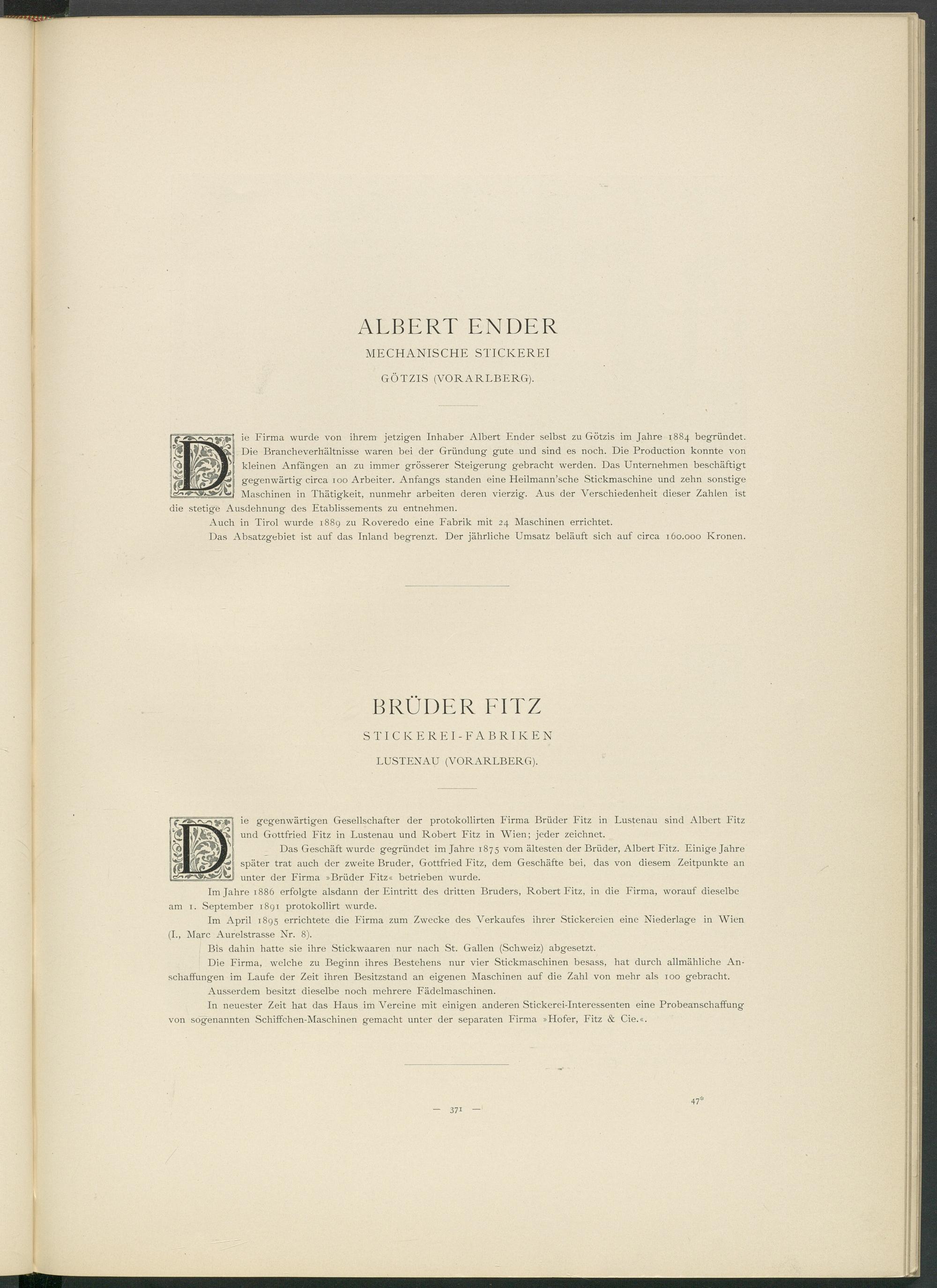 ie Firma wurde von ihrem jetzigen Inhaber Albert Ender selbst zu Götzis im Jahre 1884 begründet. Die Brancheverhältnisse waren bei der Gründung gute und sind es noch. Die Production konnte von kleinen Anfängen an zu immer grösserer Steigerung gebracht werden. Das Unternehmen beschäftigt gegenwärtig circa 100 Arbeiter. Anfangs standen eine Heilmann’sche Stickmaschine und zehn sonstige Maschinen in Thätigkeit, nunmehr arbeiten deren vierzig. Aus der Verschiedenheit dieser Zahlen ist die stetige Ausdehnung des Etablissements zu entnehmen.