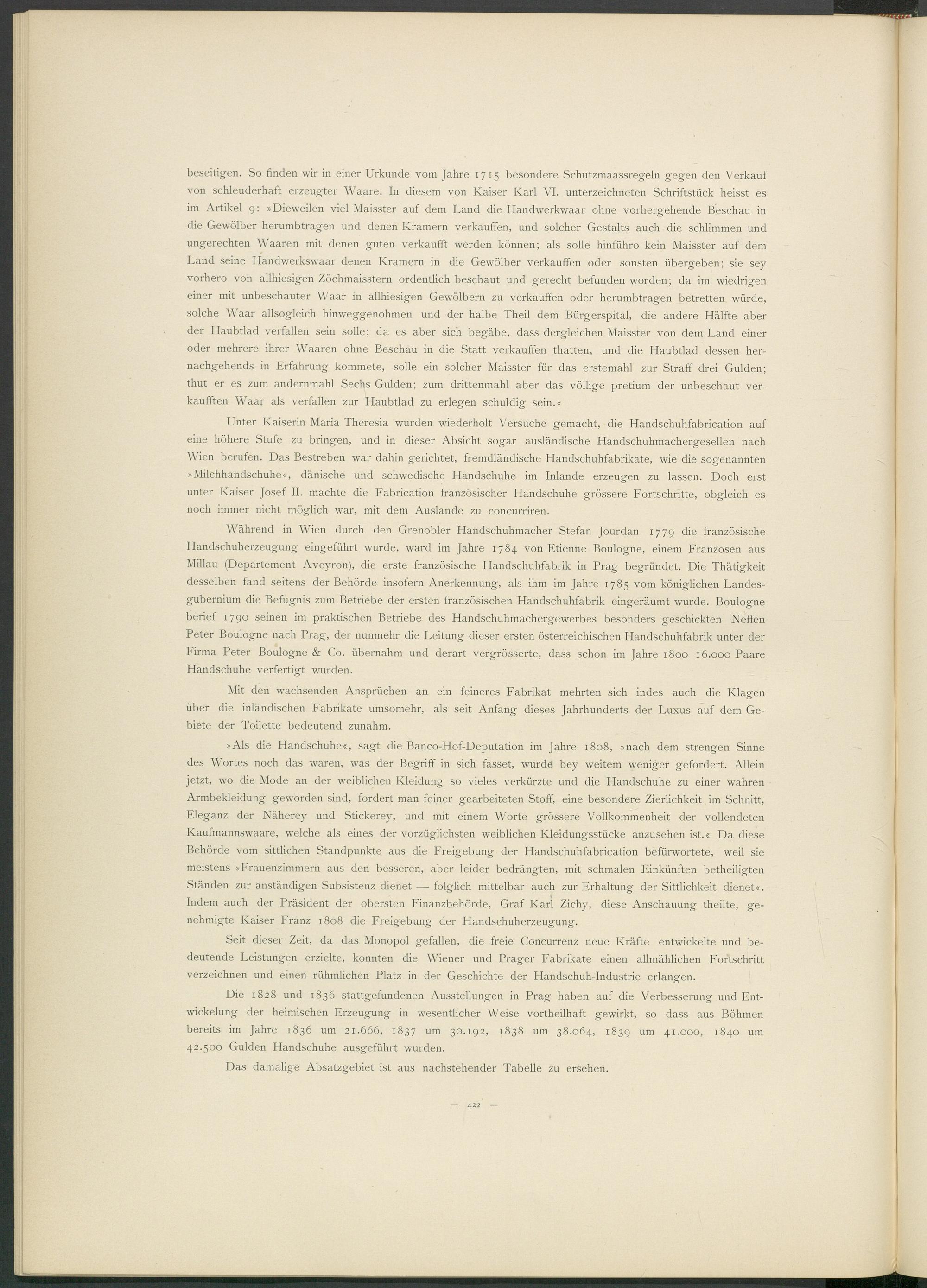 Seit dieser Zeit, da das Monopol gefallen, die freie Concurrenz neue Kräfte entwickelte und bedeutende Leistungen erzielte, konnten die Wiener und Prager Fabrikate einen allmählichen Fortschritt verzeichnen und einen rühmlichen Platz in der Geschichte der Handschuh-Industrie erlangen.