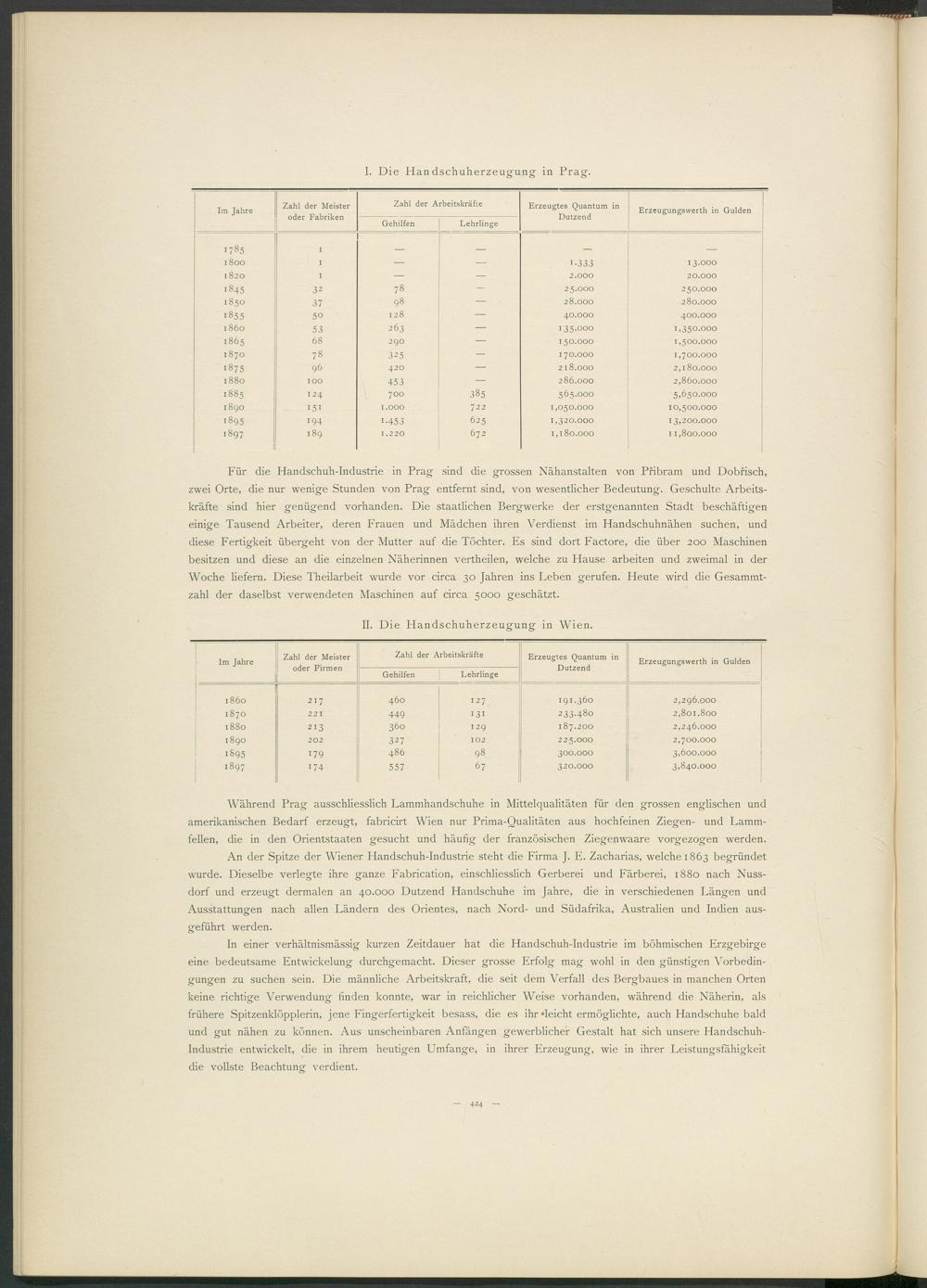 Während Prag ausschliesslich Lammhandschuhe in Mittelqualitäten für den grossen englischen und amerikanischen Bedarf erzeugt, fabricirt Wien nur Prima-Qualitäten aus hochfeinen Ziegen- und Lammfellen, die in den Orientstaaten gesucht und häufig der französischen Ziegenwaare vorgezogen werden.