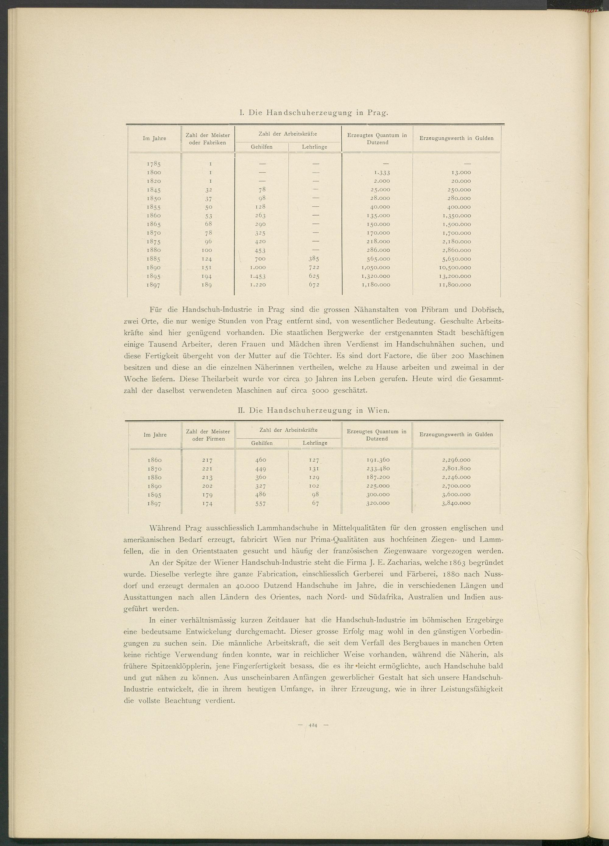 An der Spitze der Wiener Handschuh-Industrie steht die Firma J. E. Zacharias, welche 1863 begründet wurde. Dieselbe verlegte ihre ganze Fabrication, einschliesslich Gerberei und Färberei, 1880 nach Nussdorf und erzeugt dermalen an 40.000 Dutzend Handschuhe im Jahre, die in verschiedenen Längen und Ausstattungen nach allen Ländern des Orientes, nach Nord- und Südafrika, Australien und Indien ausgeführt werden.