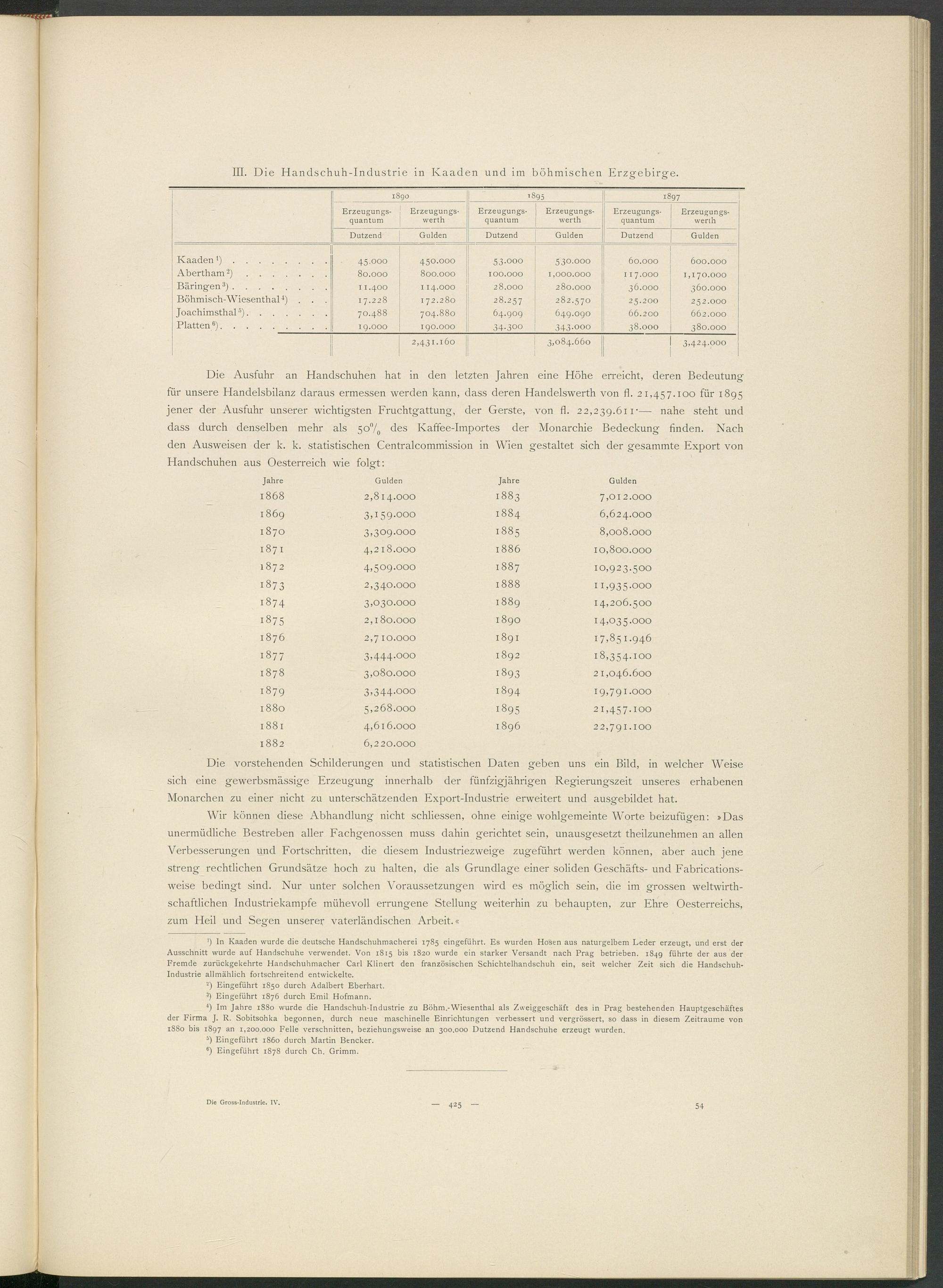 4 ) Im Jahre 1880 wurde die Handschuh-Industrie zu Böhm.-Wiesenthal als Zweiggeschäft des in Prag bestehenden Hauptgeschäftes der Firma J. R. Sobitsohka begonnen, durch neue maschinelle Einrichtungen verbessert und vergrössert, so dass in diesem Zeiträume von 1880 bis 1897 an 1,200.000 Felle verschnitten, beziehungsweise an 300.000 Dutzend Handschuhe erzeugt wurden.