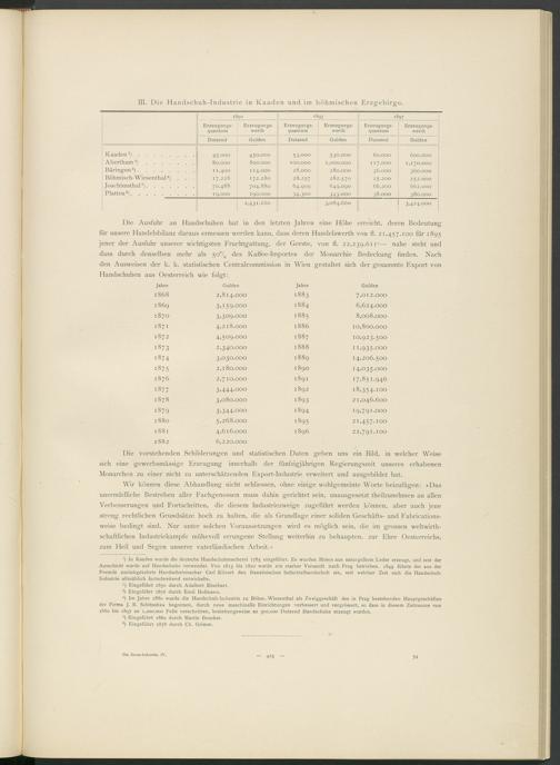 Die vorstehenden Schilderungen und statistischen Daten geben uns ein Bild, in welcher Weise sich eine gewerbsmässige Erzeugung innerhalb der fünfzigjährigen Regierungszeit unseres erhabenen Monarchen zu einer nicht zu unterschätzenden Export-Industrie erweitert und ausgebildet hat.