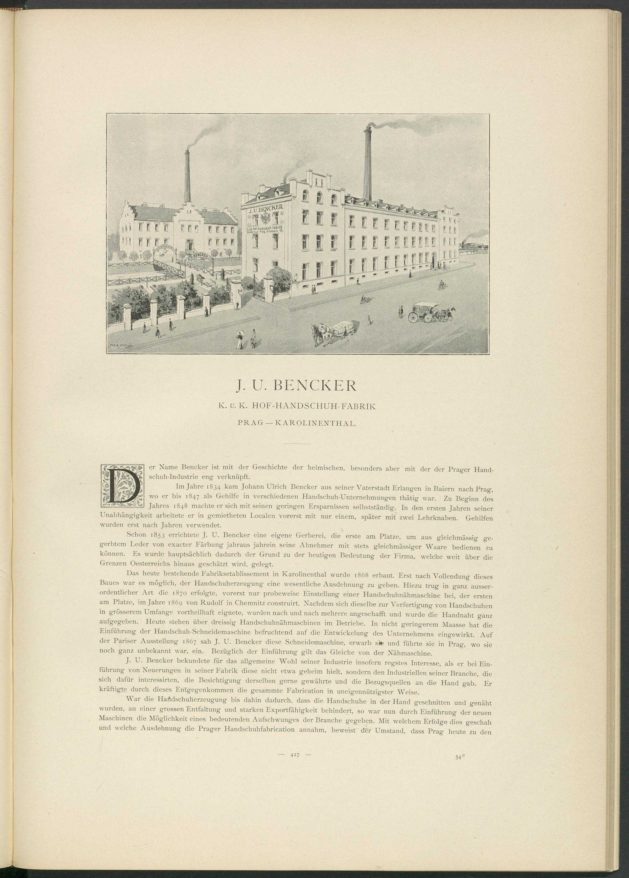 Das heute bestehende Fabriksetablissement in Karolinenthal wurde 1868 erbaut. Erst nach Vollendung dieses Baues war es möglich, der Handschuherzeugung eine wesentliche Ausdehnung zu geben. Hiezu trug in ganz ausserordentlicher Art die 1870 erfolgte, vorerst nur probeweise Einstellung einer Handschuhnähmaschine bei, der ersten am Platze, im Jahre 1869 von Rudolf in Chemnitz construirt. Nachdem sich dieselbe zur Verfertigung von Handschuhen in grösserem Umfange vortheilhaft eignete, wurden nach und nach mehrere angeschafft und wurde die Handnaht ganz aufgegeben. Heute stehen über dreissig Handschuhnähmaschinen im Betriebe. In nicht geringerem Maasse hat die Einführung der Handschuh-Schneidemaschine befruchtend auf die Entwickelung des Unternehmens eingewirkt. Auf der Pariser Ausstellung 1867 sah J. U. Bencker diese Schneidemaschine, erwarb sie und führte sie in Prag, wo sie noch ganz unbekannt war, ein. Bezüglich der Einführung gilt das Gleiche von der Nähmaschine.