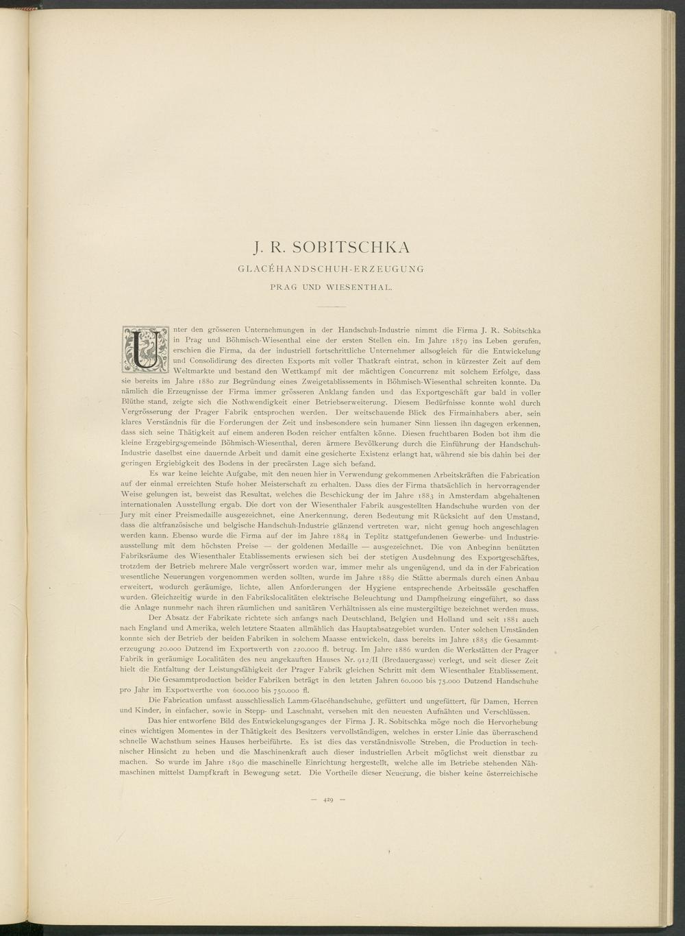 nter den grösseren Unternehmungen in der Handschuh-Industrie nimmt die Firma J. R. Sobitschka in Prag und Böhmisch-Wiesenthal eine der ersten Stellen ein. Im Jahre 187g ins Leben gerufen, erschien die Firma, da der industriell fortschrittliche Unternehmer allsogleich für die Entwickelung und Consolidirung des directen Exports mit voller Thatkraft eintrat, schon in kürzester Zeit auf dem Weltmärkte und bestand den Wettkampf mit der mächtigen Concurrenz mit solchem Erfolge, dass sie bereits im Jahre 1880 zur Begründung eines Zweigetablissements in Böhmisch-Wiesenthal schreiten konnte. Da nämlich die Erzeugnisse der Firma immer grösseren Anklang fanden und das Exportgeschäft gar bald in voller Blüthe stand, zeigte sich die Nothwendigkeit einer Betriebserweiterung. Diesem Bedürfnisse konnte wohl durch Yergrösserung der Prager Fabrik entsprochen werden. Der weitschauende Blick des Firmainhabers aber, sein klares Verständnis für die P'orderungen der Zeit und insbesondere sein humaner Sinn liessen ihn dagegen erkennen, dass sich seine Thätigkeit auf einem anderen Boden reicher entfalten könne. Diesen fruchtbaren Boden bot ihm die kleine Erzgebirgsgemeinde Böhmisch-Wiesenthal, deren ärmere Bevölkerung durch die Einführung der Handschuh- Industrie daselbst eine dauernde Arbeit und damit eine gesicherte Existenz erlangt hat, während sie bis dahin bei der geringen Ergiebigkeit des Bodens in der precärsten Lage sich befand.