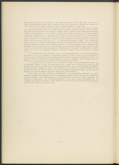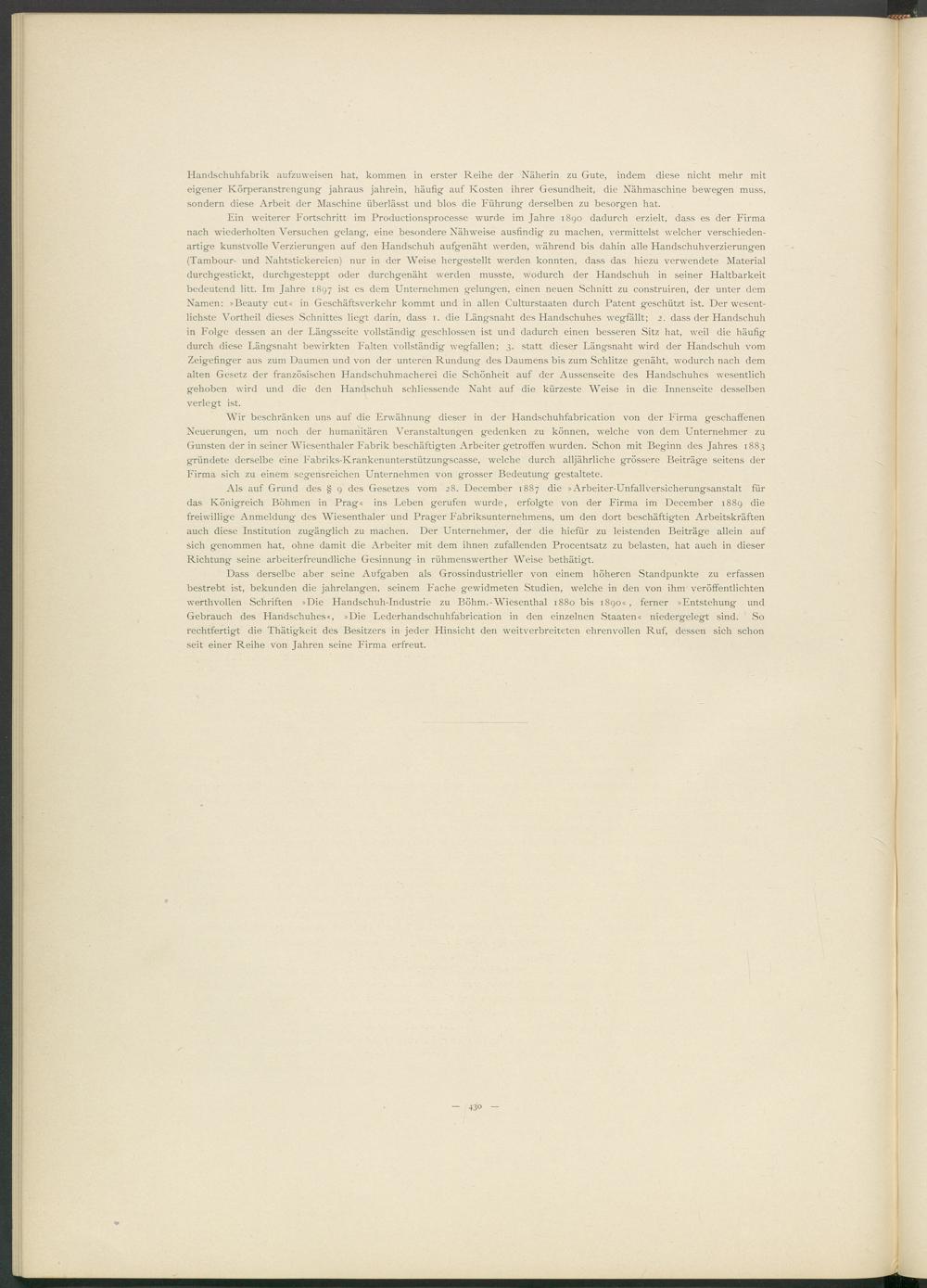 Wir beschränken uns auf die Erwähnung dieser in der Handschuhfabrication von der Firma geschaffenen Neuerungen, um noch der humanitären Veranstaltungen gedenken zu können, welche von dem Unternehmer zu Gunsten der in seiner Wiesenthaler Fabrik beschäftigten Arbeiter getroffen wurden. Schon mit Beginn des Jahres 1883 gründete derselbe eine Fabriks-Krankenunterstützungscasse, welche durch alljährliche grössere Beiträge seitens der Firma sich zu einem segensreichen Unternehmen von grosser Bedeutung gestaltete.