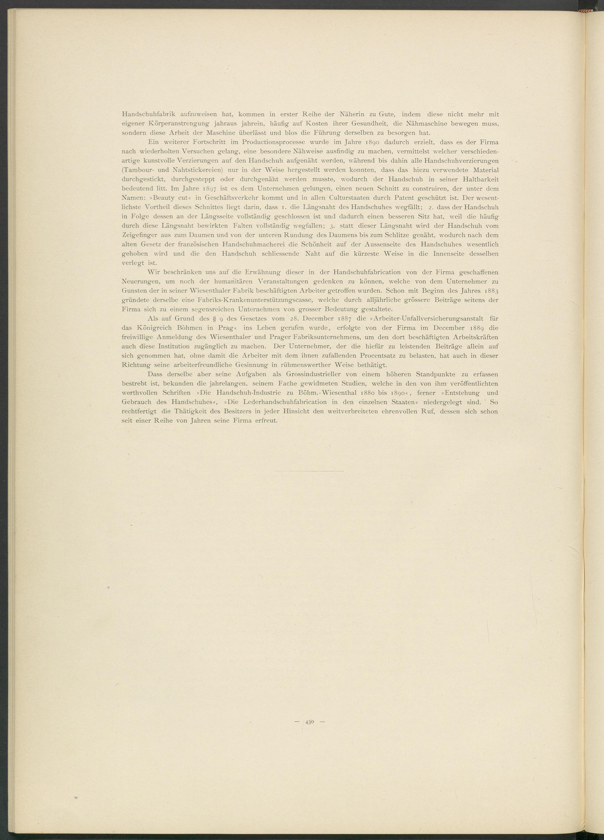 Ein weiterer Fortschritt im Productionsprocesse wurde im Jahre 1890 dadurch erzielt, dass es der Firma nach wiederholten Versuchen gelang, eine besondere Nähweise ausfindig zu machen, vermittelst welcher verschiedenartige kunstvolle Verzierungen auf den Handschuh aufgenäht werden, während bis dahin alle Handschuhverzierungen (Tambour- und Nahtstickereien) nur in der Weise hergestellt werden konnten, dass das hiezu verwendete Material durchgestickt, durchgesteppt oder durchgenäht werden musste, wodurch der Handschuh in seiner Haltbarkeit bedeutend litt. Im Jahre 1897 ist es dem Unternehmen gelungen, einen neuen Schnitt zu construiren, der unter dem Namen: »Beauty cut« in Geschäftsverkehr kommt und in allen Culturstaaten durch Patent geschützt ist. Der wesentlichste Vortheil dieses Schnittes liegt darin, dass 1. die Längsnaht des Handschuhes wegfällt; 2. dass der Handschuh in Folge dessen an der Längsseite vollständig geschlossen ist und dadurch einen besseren Sitz hat, weil die häufig durch diese Längsnaht bewirkten Falten vollständig wegfallen; 3. statt dieser Längsnaht wird der Handschuh vom Zeigefinger aus zum Daumen und von der unteren Rundung des Daumens bis zum Schlitze genäht, wodurch nach dem alten Gesetz der französischen Handschuhmacherei die Schönheit auf der Aussenseite des Handschuhes wesentlich gehoben wird und die den Handschuh schliessende Naht auf die kürzeste Weise in die Innenseite desselben verlegt ist.