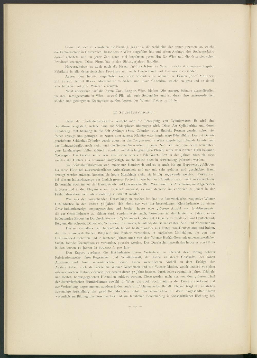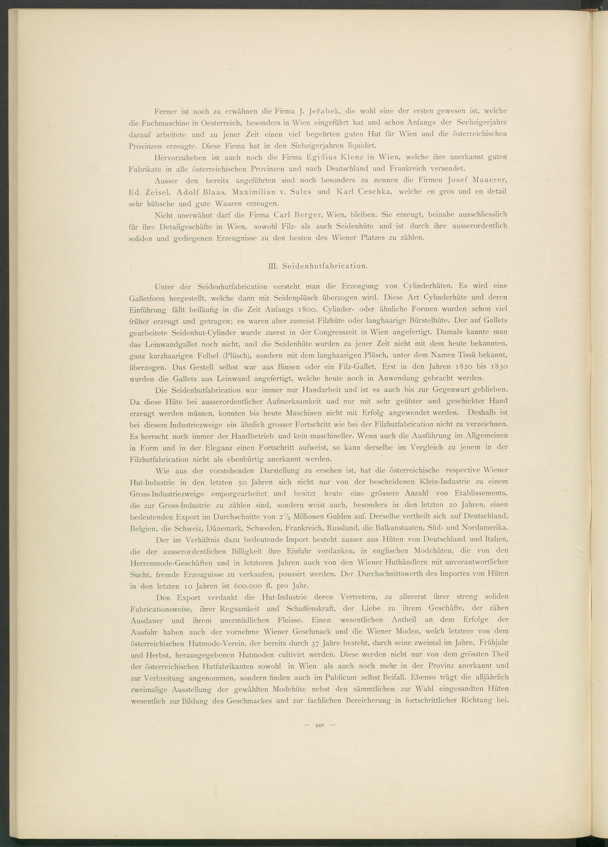 Ferner ist noch zu erwähnen die Firma J. Jerabek, die wohl eine der ersten gewesen ist, welche die Fachmaschine in Oesterreich, besonders in Wien eingeführt hat und schon Anfangs der Sechzigerjahre darauf arbeitete und zu jener Zeit einen viel begehrten guten Hut für Wien und die österreichischen Provinzen erzeugte. Diese Firma hat in den Siebzigerjahren liquidirt.