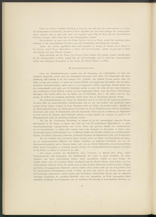 Nicht unerwähnt darf die Firma Carl Berger, Wien, bleiben. Sie erzeugt, beinahe ausschliesslich für ihre Detailgeschäfte in Wien, sowohl Filz- als auch Seidenhüte und ist durch ihre ausserordentlich soliden und gediegenen Erzeugnisse zu den besten des Wiener Platzes zu zählen.