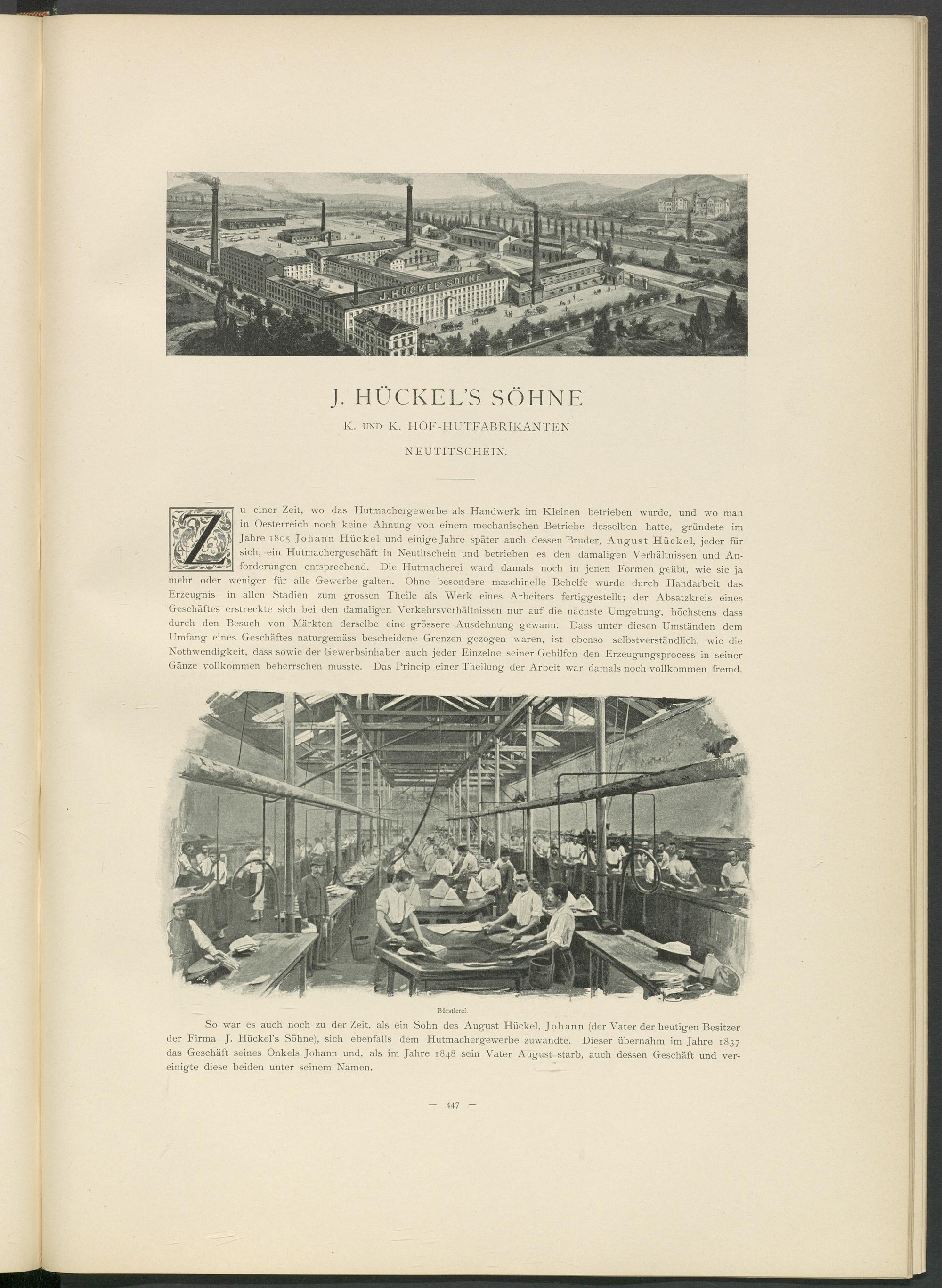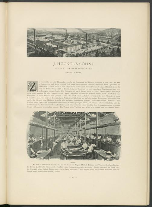 u einer Zeit, wo das Hutmachergewerbe als Handwerk im Kleinen betrieben wurde, und wo man in Oesterreich noch keine Ahnung von einem mechanischen Betriebe desselben hatte, gründete im Jahre 1805 Johann Hückel und einige Jahre später auch dessen Bruder, August Hückel, jeder für sich, ein Hutmachergeschäft in Neutitschein und betrieben es den damaligen Verhältnissen und Anforderungen entsprechend. Die Hutmacherei ward damals noch in jenen Formen geübt, wie sie ja mehr oder weniger für alle Gewerbe galten. Ohne besondere maschinelle Behelfe wurde durch Handarbeit das Erzeugnis in allen Stadien zum grossen Theile als Werk eines Arbeiters fertiggestellt; der Absatzkieis eines Geschäftes erstreckte sich bei den damaligen Verkehrsverhältnissen nur auf die nächste Umgebung, höchstens dass durch den Besuch von Märkten derselbe eine grössere Ausdehnung gewann. Dass unter diesen Umständen dem Umfang eines Geschäftes naturgemäss bescheidene Grenzen gezogen waren, ist ebenso selbstverständlich, wie die Nothwendigkeit, dass sowie der Gewerbsinhaber auch jeder Einzelne seiner Gehilfen den Erzeugungsprocess in seiner Gänze vollkommen beherrschen musste. Das Princip einer Theilung der Arbeit war damals noch vollkommen fremd.