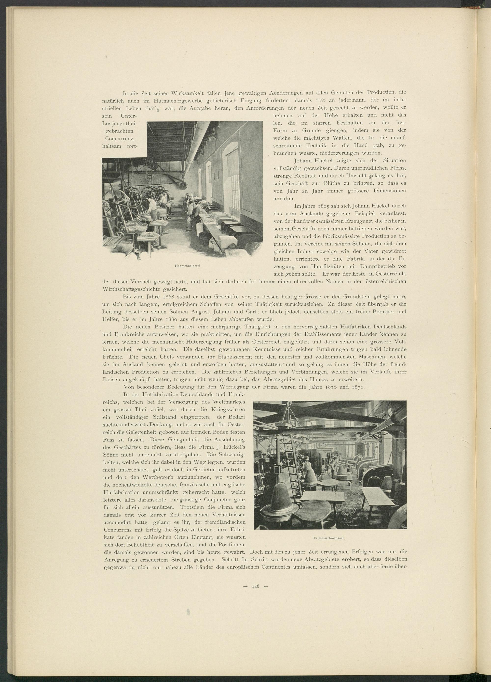 In der Hutfabrication Deutschlands und Frankreichs, welchen bei der Versorgung des Weltmarktes ein grosser Theil zufiel, war durch die Kriegswirren ein vollständiger Stillstand eingetreten, der Bedarf suchte anderwärts Deckung, und so war auch für Oesterreich die Gelegenheit geboten auf fremden Boden festen Fuss zu fassen. Diese Gelegenheit, die Ausdehnung des Geschäftes zu fördern, liess die Firma J. Hückel’s Söhne nicht unbenützt vorübergehen. Die Schwierigkeiten, welche sich ihr dabei in den Weg legten, wurden nicht unterschätzt, galt es doch in Gebieten aufzutreten und dort den Wettbewerb aufzunehmen, wo vordem die hochentwickelte deutsche, französische und englische Hutfabrication unumschränkt geherrscht hatte, w r elch letztere alles daransetzte, die günstige Conjunctur ganz für sich allein auszunützen. Trotzdem die Firma sich damals erst vor kurzer Zeit den neuen Verhältnissen accomodirt hatte, gelang es ihr, der fremdländischen Concurrenz mit Erfolg die Spitze zu bieten; ihre Fabrikate fanden in zahlreichen Orten Eingang, sie wussten sich dort Beliebtheit zu verschaffen, und die Positionen, die damals gewonnen wurden, sind bis heute gewahrt. Doch mit den zu jener Zeit errungenen Erfolgen war nur die Anregung zu erneuertem Streben gegeben. Schritt für Schritt wurden neue Absatzgebiete erobert, so dass dieselben gegenwärtig nicht nur nahezu alle Länder des europäischen Continentes umfassen, sondern sich auch über ferne über-