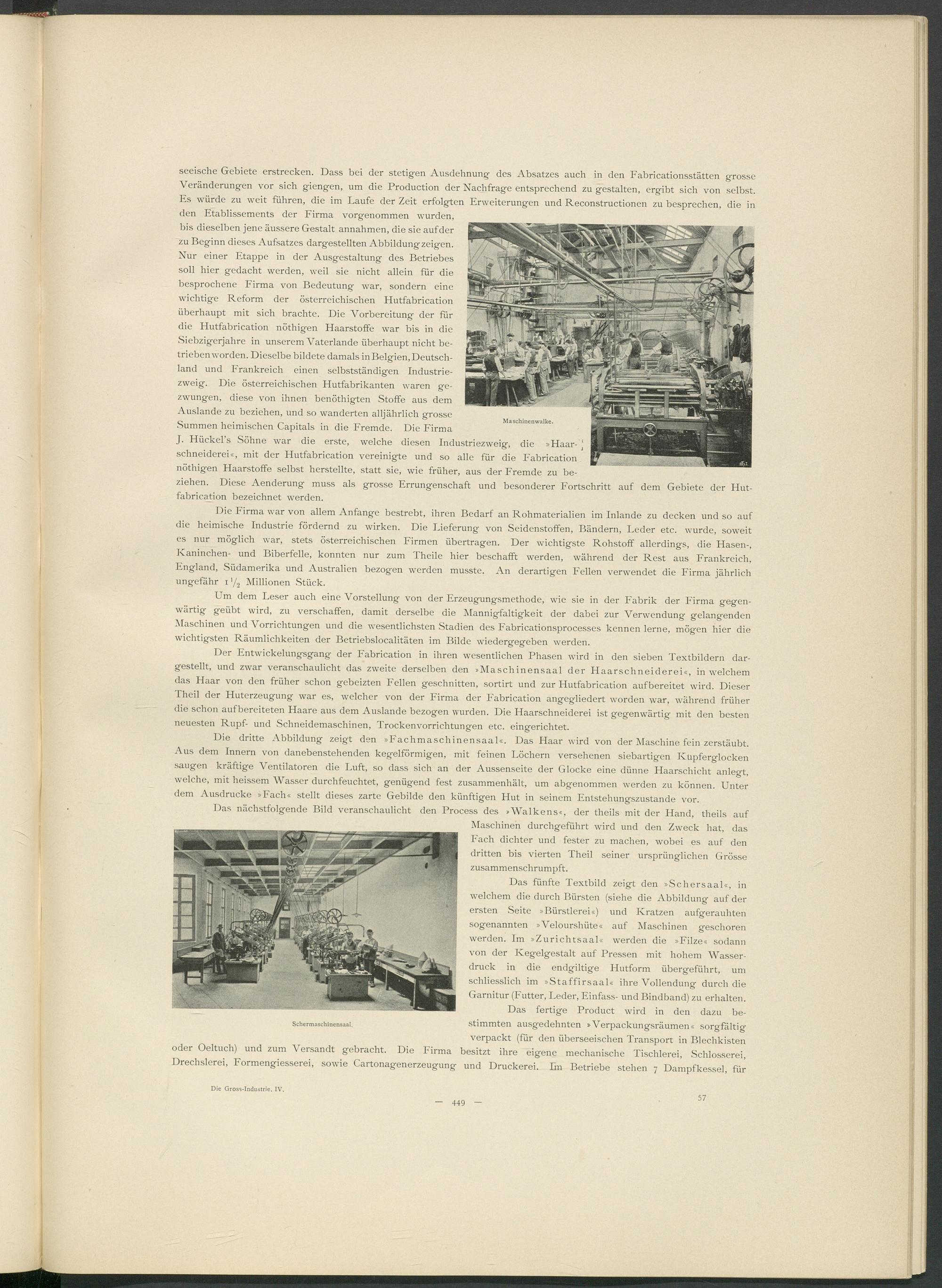 Nur einer Etappe in der Ausgestaltung des Betriebes soll hier gedacht werden, weil sie nicht allein für die besprochene Firma von Bedeutung war, sondern eine wichtige Reform der österreichischen Hutfabrication überhaupt mit sich brachte. Die Vorbereitung der für die Hutfabrication nöthigen Haarstoffe war bis in die Siebzigerjahre in unserem Vaterlande überhaupt nicht betriebenworden. Dieselbe bildete damals inBelgien,Deutschland und Frankreich einen selbstständigen Industriezweig. Die österreichischen Hutfabrikanten waren gezwungen, diese von ihnen benöthigten Stoffe aus dem Auslande zu beziehen, und so wanderten alljährlich grosse Summen heimischen Capitals in die Fremde. Die Firma J. Hückel’s Söhne war die erste, welche diesen Industriezweig,