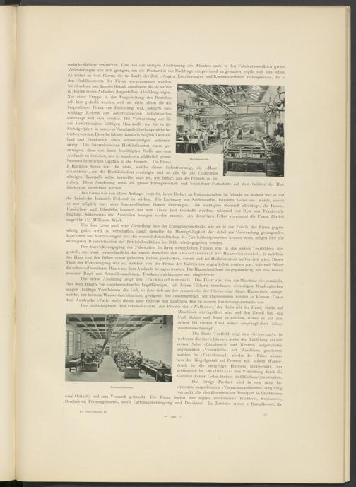 Der Entwickelungsgang der Fabrication in ihren wesentlichen Phasen wird in den sieben Textbildern dargestellt, und zwar veranschaulicht das zweite derselben den »Maschinensaal der Haarschneiderei«, in welchem das Haar von den früher schon gebeizten Fellen geschnitten, sortirt und zur Hutfabrication aufbereitet wird. Dieser Theil der Huterzeugung war es, welcher von der Firma der Fabrication angegliedert worden war, während früher die schon aufbereiteten Haare aus dem Auslande bezogen wurden. Die Haarschneiderei ist gegenwärtig mit den besten neuesten Rupf- und Schneidemaschinen, Trockenvorrichtungen etc. eingerichtet.