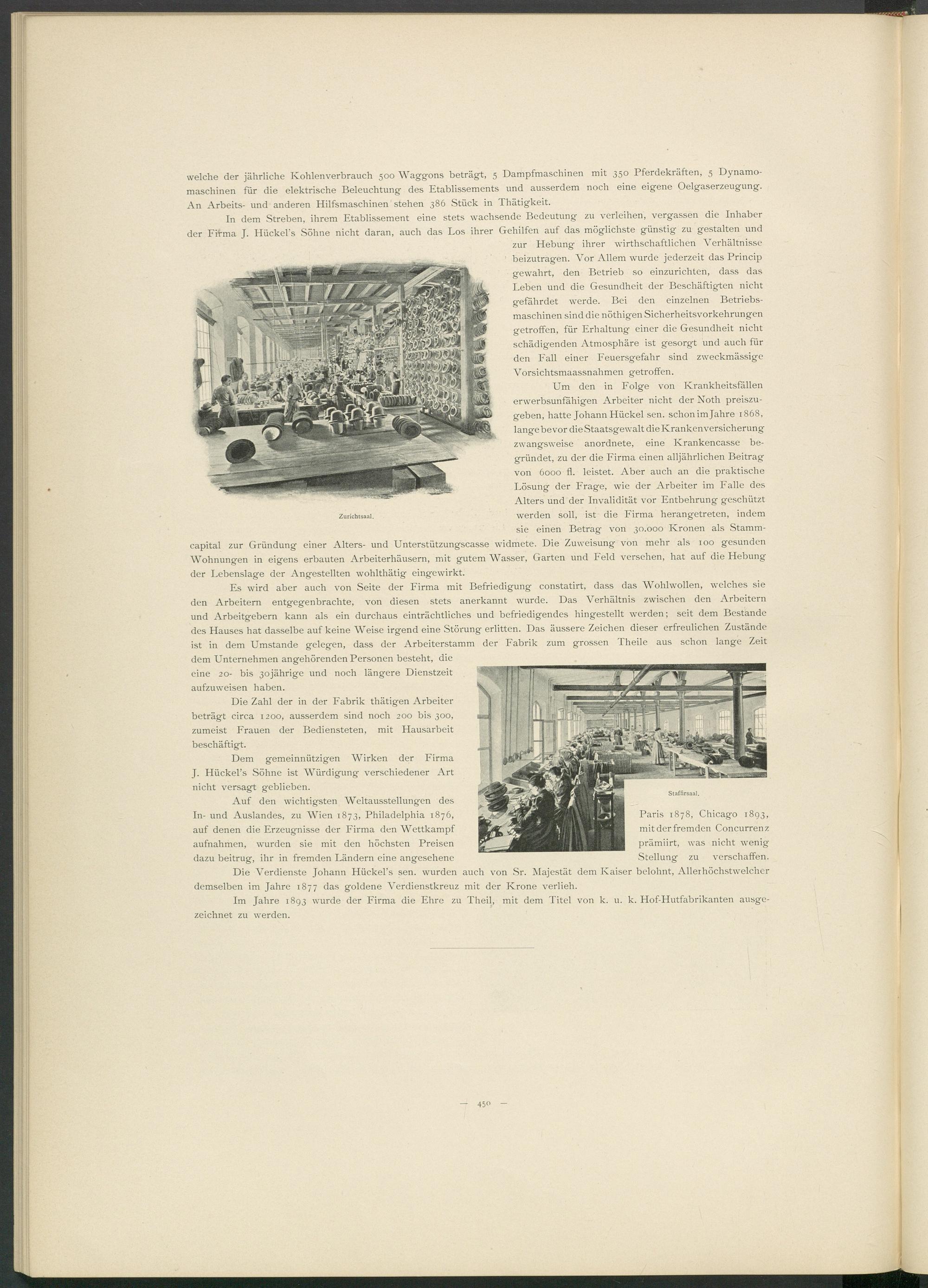 Es wird aber auch von Seite der Firma mit Befriedigung constatirt, dass das Wohlwollen, welches sie den Arbeitern entgegenbrachte, von diesen stets anerkannt wurde. Das Verhältnis zwischen den Arbeitern und Arbeitgebern kann als ein durchaus einträchtliches und befriedigendes hingestellt werden; seit dem Bestände des Hauses hat dasselbe auf keine Weise irgend eine Störung erlitten. Das äussere Zeichen dieser erfreulichen Zustände ist in dem Umstande gelegen, dass der Arbeiterstamm der Fabrik zum grossen Theile aus schon lange Zeit dem Unternehmen angehörenden Personen besteht, die eine 20- bis 30jährige und noch längere Dienstzeit aufzuweisen haben.