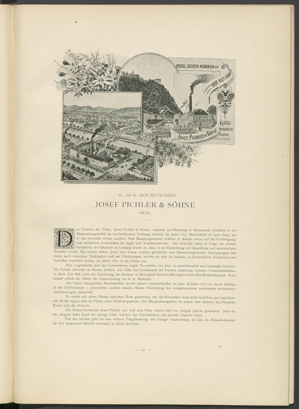 er Gründer der Firma »Josef Pichler & Söhne« stammte aus Hartberg- in Steiermark, woselbst er ein Hutmachergeschäft im bescheidensten Umfange betrieb. Im Jahre 1857 übersiedelte er nach Graz, wo er das Gewerbe weiter ausübte. Sein Hauptaugenmerk richtete er damals schon auf die Verfertigung von steirischen Lodenhüten für Jagd- und Touristenzwecke. Das Geschäft nahm in Folge des reellen Gebahrens des Inhabers an Umfang derart zu, dass er zur Einrichtung mit Maschinen und motorischem Betriebe schritt. Die beiden Söhne, Josef und Anton, wurden gleichfalls zum Hutmachergewerbe herangezogen und traten nach erreichter Tüchtigkeit und mit Erfahrungen, welche sie sich im Inlande, in Deutschland, Frankreich und Amerika erworben hatten, im Jahre 1880 in die Firma ein.