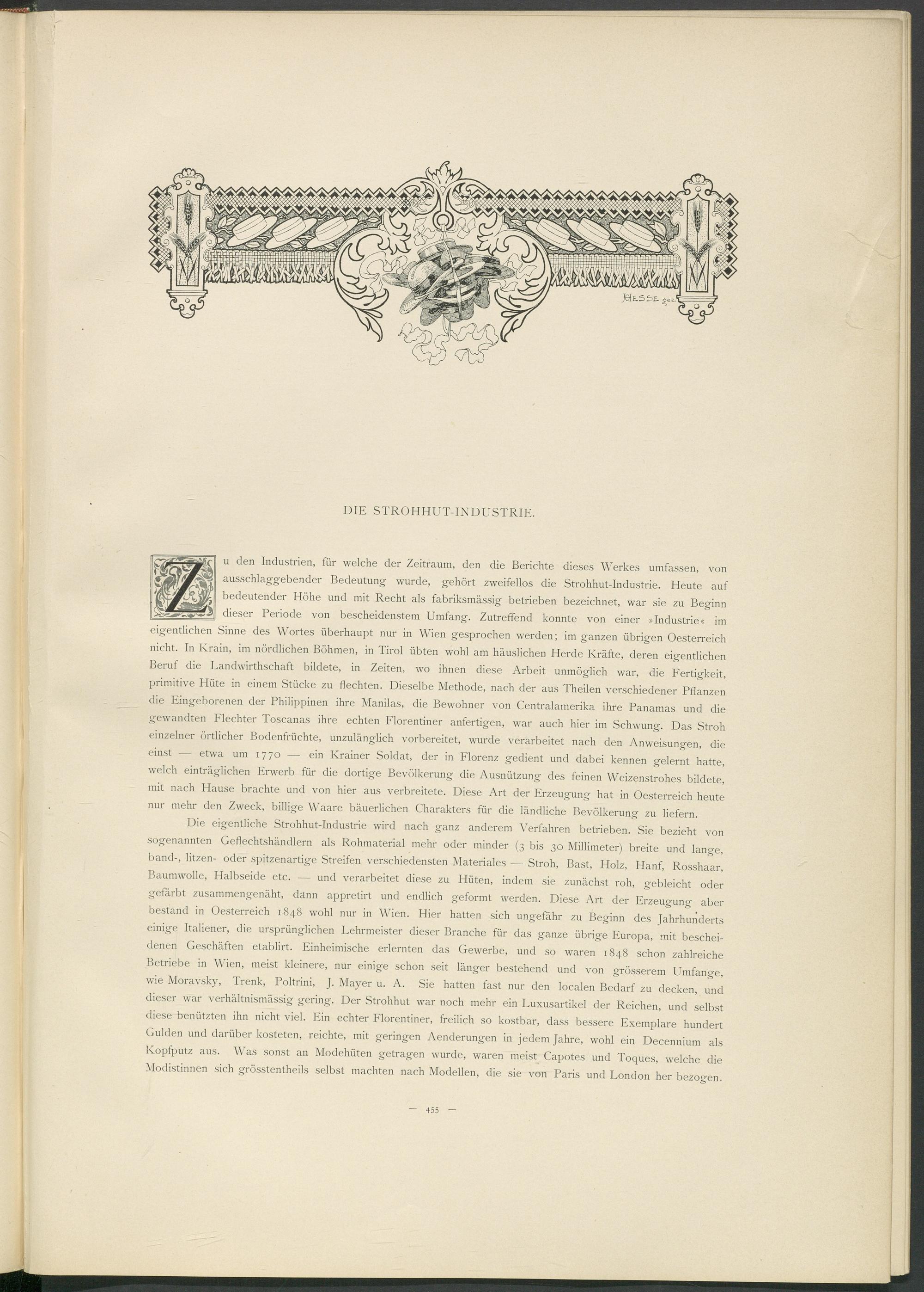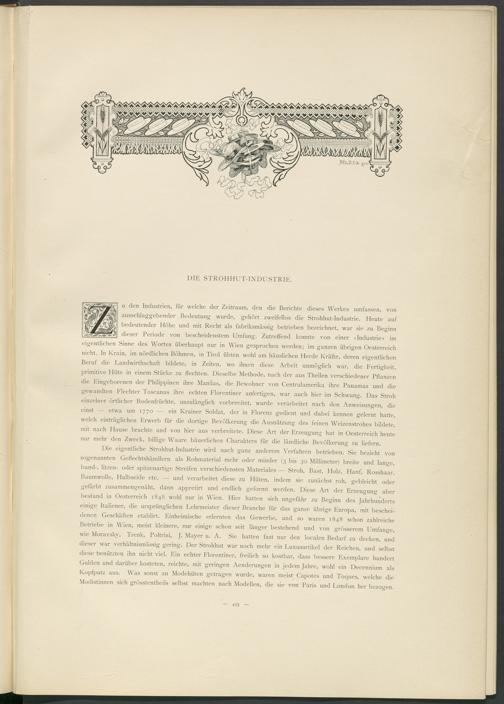 u den Industrien, für welche der Zeitraum, den die Berichte dieses Werkes umfassen, von ausschlaggebender Bedeutung wurde, gehört zweifellos die Strohhut-Industrie. Heute auf bedeutender Höhe und mit Recht als fabriksmässig betrieben bezeichnet, war sie zu Beginn dieser Periode von bescheidenstem Umfang. Zutreffend konnte von einer »Industrie« im eigentlichen Sinne des Wortes überhaupt nur in Wien gesprochen werden; im ganzen übrigen Oesterreich nicht. In Krain, im nördlichen Böhmen, in Tirol übten wohl am häuslichen Herde Kräfte, deren eigentlichen Beruf die Landwirthschaft bildete, in Zeiten, wo ihnen diese Arbeit unmöglich war, die Fertigkeit, primitive Hüte in einem Stücke zu flechten. Dieselbe Methode, nach der aus Theilen verschiedener Pflanzen die Eingeborenen der Philippinen ihre Manilas, die Bewohner von Centralamerika ihre Panamas und die gewandten Flechter Toscanas ihre echten Florentiner anfertigen, war auch hier im Schwung. Das Stroh einzelner örtlicher Bodenfrüchte, unzulänglich vorbereitet, wurde verarbeitet nach den Anweisungen, die einst — etwa um 1770 — ein Krainer Soldat, der in Florenz gedient und dabei kennen gelernt hatte, welch einträglichen Erwerb für die dortige Bevölkerung die Ausnützung des feinen Weizenstrohes bildete, mit nach Hause brachte und von hier aus verbreitete. Diese Art der Erzeugung hat in Oesterreich heute nur mehr den Zweck, billige Waare bäuerlichen Charakters für die ländliche Bevölkerung zu liefern.