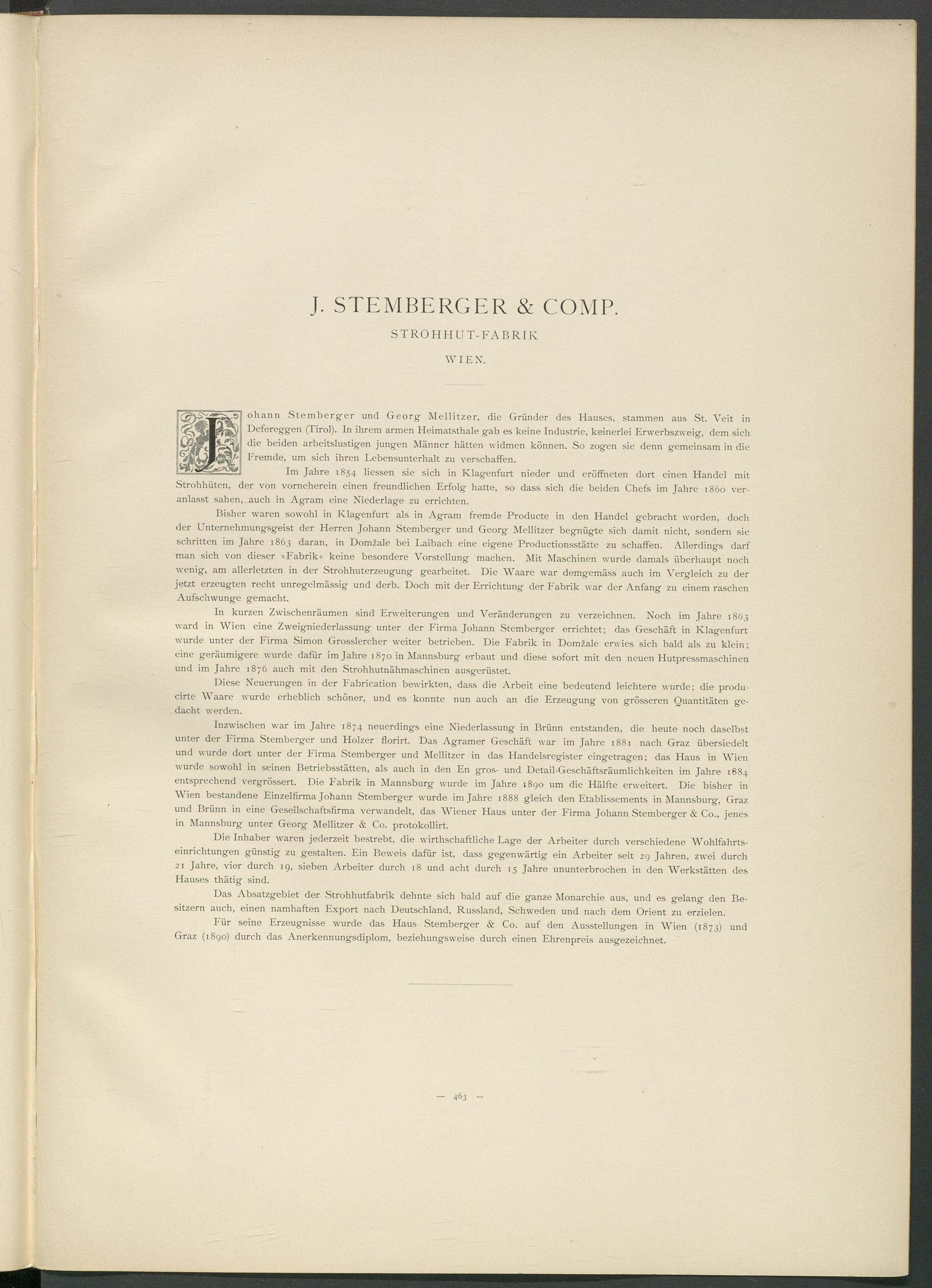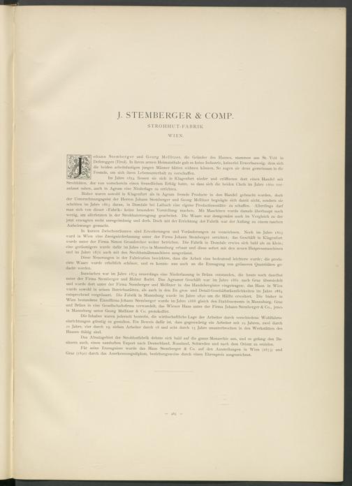 Inzwischen war im Jahre 1874 neuerdings eine Niederlassung in Brünn entstanden, die heute noch daselbst unter der Firma Stemberger und Holzer florirt. Das Agramer Geschäft war im Jahre 1881 nach Graz übersiedelt und wurde dort unter der Firma Stemberger und Mellitzer in das Handelsregister eingetragen; das Haus in Wien wmrde sowohl in seinen Betriebsstätten, als auch in den En gros- und Detail-Geschäftsräumlichkeiten im Jahre 1884 entsprechend vergrössert. Die Fabrik in Mannsburg wmrde im Jahre 1890 um die Hälfte erweitert. Die bisher in Wien bestandene Einzelfirma Johann Stemberger wmrde im Jahre 1888 gleich den Etablissements in Mannsburg, Graz und Brünn in eine Gesellschaftsfirma verwandelt, das Wiener Haus unter der Firma Johann Stemberger & Co., jenes in Mannsburg unter Georg Mellitzer & Co. protokollirt.
