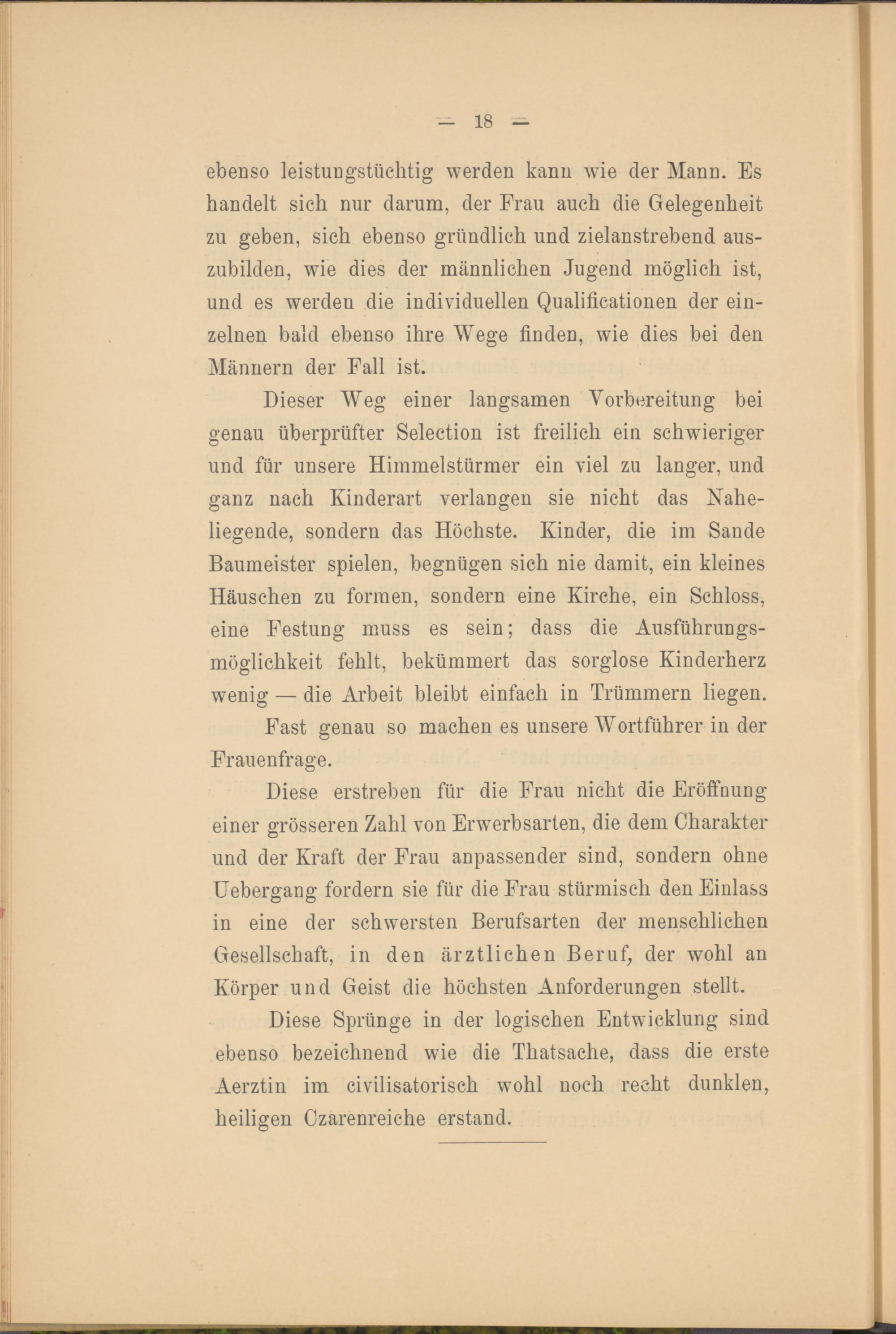 Diese erstreben für die Frau nicht die Eröffnung einer grösseren Zahl von Erwerbsarten, die dem Charakter und der Kraft der Frau anpassender sind, sondern ohne Uebergang fordern sie für die Frau stürmisch den Einlass in eine der schwersten Berufsarten der menschlichen Gesellschaft, in den ärztlichen Beruf, der wohl an Körper und Geist die höchsten Anforderungen stellt.