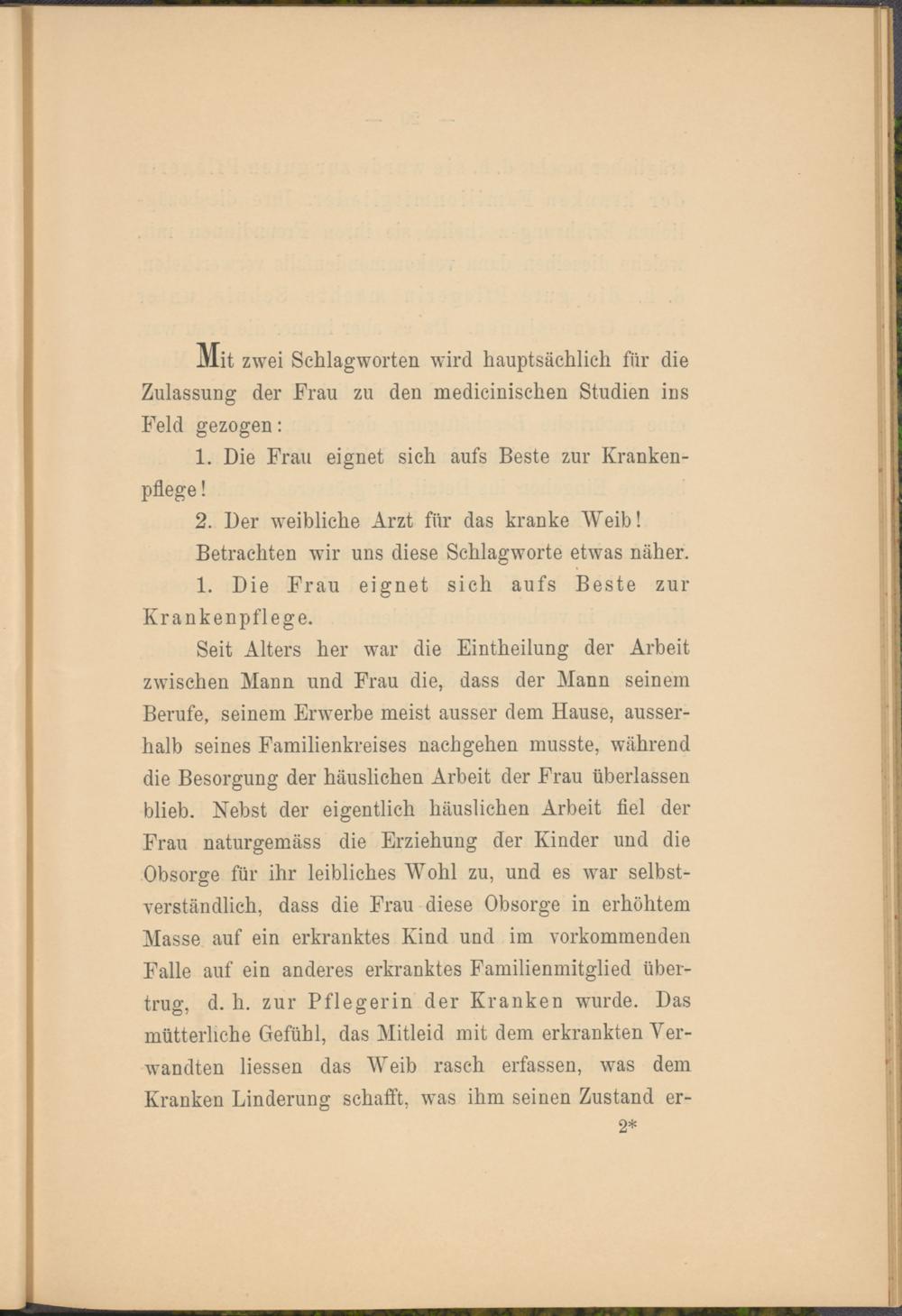 Seit Alters her war die Eintheilung der Arbeit zwischen Mann und Frau die, dass der Mann seinem Berufe, seinem Erwerbe meist ausser dem Hause, ausserhalb seines Familienkreises nachgehen musste, während die Besorgung der häuslichen Arbeit der Frau überlassen blieb. Nebst der eigentlich häuslichen Arbeit fiel der Frau naturgemäss die Erziehung der Kinder und die Obsorge für ihr leibliches Wohl zu, und es war selbstverständlich, dass die Frau diese Obsorge in erhöhtem Masse auf ein erkranktes Kind und im vorkommenden Falle auf ein anderes erkranktes Familienmitglied übertrug, d. h. zur Pflegerin der Kranken wurde. Das mütterliche Gefühl, das Mitleid mit dem erkrankten Verwandten Hessen das Weib rasch erfassen, was dem Kranken Linderung schafft, was ihm seinen Zustand er-
