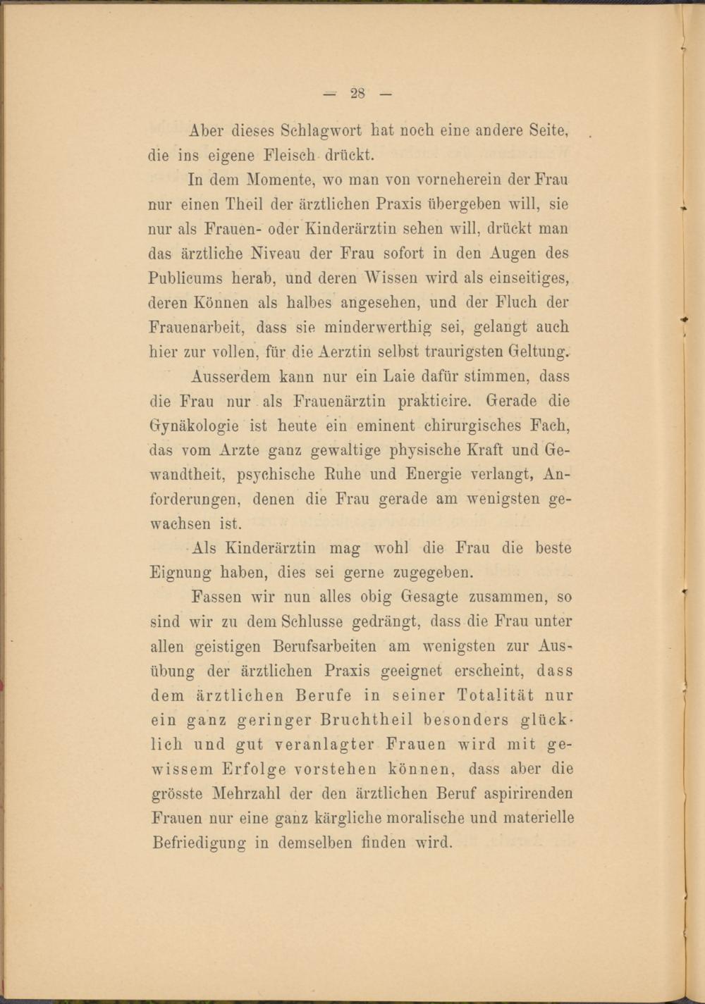 Fassen wir nun alles obig Gesagte zusammen, so sind wir zu dem Schlüsse gedrängt, dass die Frau unter allen geistigen Berufsarbeiten am wenigsten zur Ausübung der ärztlichen Praxis geeignet erscheint, dass dem ärztlichen Berufe in seiner Totalität nur ein ganz geringer Bruchtheil besonders glücklich und gut veranlagter Frauen wird mit gewissem Erfolge vorstehen können, dass aber die grösste Mehrzahl der den ärztlichen Beruf aspirirenden Frauen nur eine ganz kärgliche moralische und materielle Befriedigung in demselben finden wird.