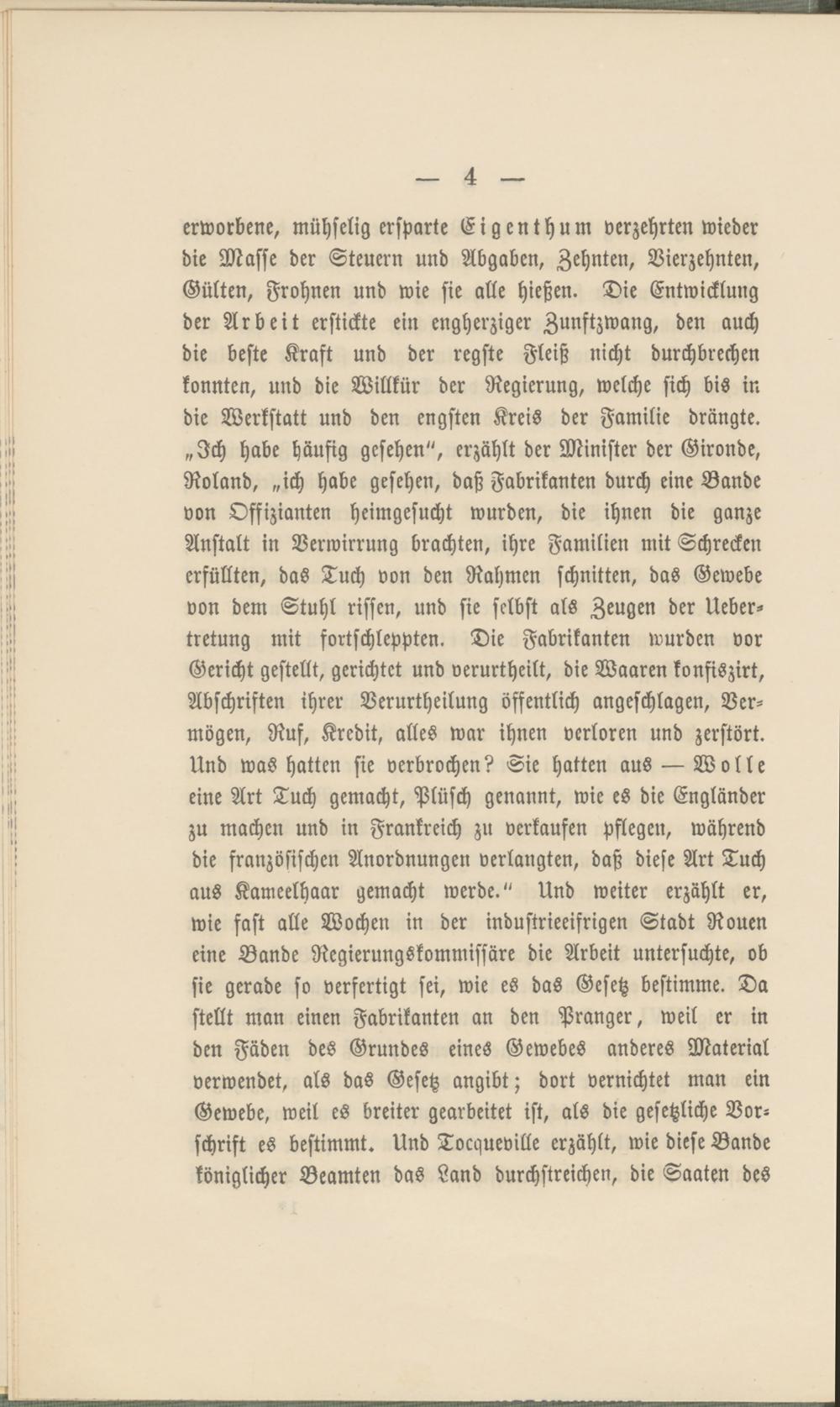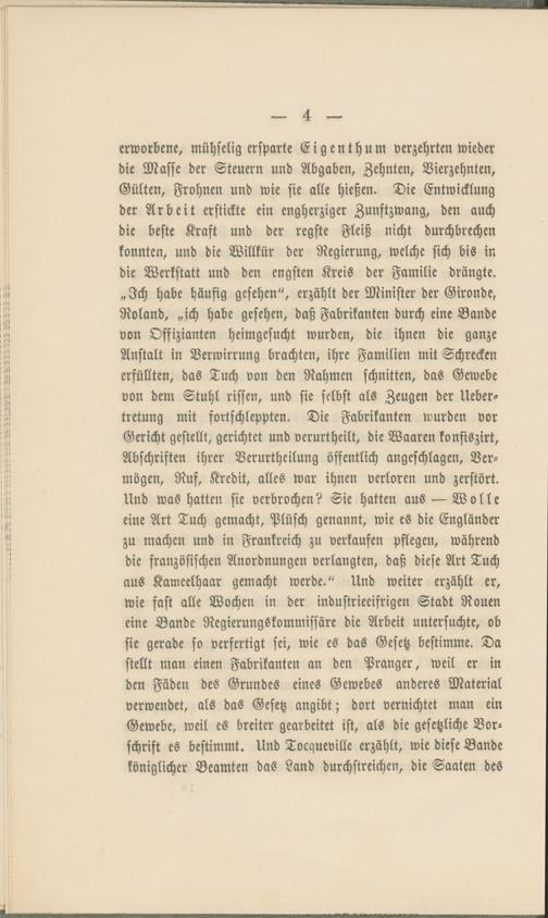 erworbene, mühselig ersparte Eigenthum verzehrten wieder die Masse der Steuern und Abgaben, Zehnten, Vierzehnten, Gülten, Frohnen und wie sie alle hießen. Die Entwicklung der Arbeit erstickte ein engherziger Zunftzwang, den auch die beste Kraft und der regste Fleiß nicht durchbrechen konnten, und die Willkür der Regierung, welche sich bis in die Werkstatt und den engsten Kreis der Familie drängte. „Ich habe häufig gesehen", erzählt der Minister der Gironde, Roland, „ich habe gesehen, daß Fabrikanten durch eine Bande von Offizianten heimgesucht wurden, die ihnen die ganze Anstalt in Verwirrung brachten, ihre Familien mit Schrecken erfüllten, das Tuch von den Rahmen schnitten, das Gewebe von dem Stuhl rissen, und sie selbst als Zeugen der Ueber- tretung mit fortschleppten. Die Fabrikanten wurden vor Gericht gestellt, gerichtet und verurtheilt, die Waaren konfiszirt, Abschriften ihrer Verurtheilung öffentlich angeschlagen, Vermögen, Ruf, Kredit, alles war ihnen verloren und zerstört. Und was hatten sie verbrochen? Sie hatten aus — Wolle eine Art Tuch gemacht, Plüsch genannt, wie es die Engländer zu machen und in Frankreich zu verkaufen Pflegen, während die französischen Anordnungen verlangten, daß diese Art Tuch aus Kameelhaar gemacht werde." Und weiter erzählt er, wie fast alle Wochen in der industrieeifrigen Stadt Rouen eine Bande Regierungskommissäre die Arbeit untersuchte, ob sie gerade so verfertigt sei, wie es das Gesetz bestimme. Da stellt man einen Fabrikanten an den Pranger, weil er in den Fäden des Grundes eines Gewebes anderes Material verwendet, als das Gesetz angibt; dort vernichtet man ein Gewebe, weil es breiter gearbeitet ist, als die gesetzliche Vorschrift es bestimmt. Und Tocqueville erzählt, wie diese Bande königlicher Beamten das Land durchstreichen, die Saaten des