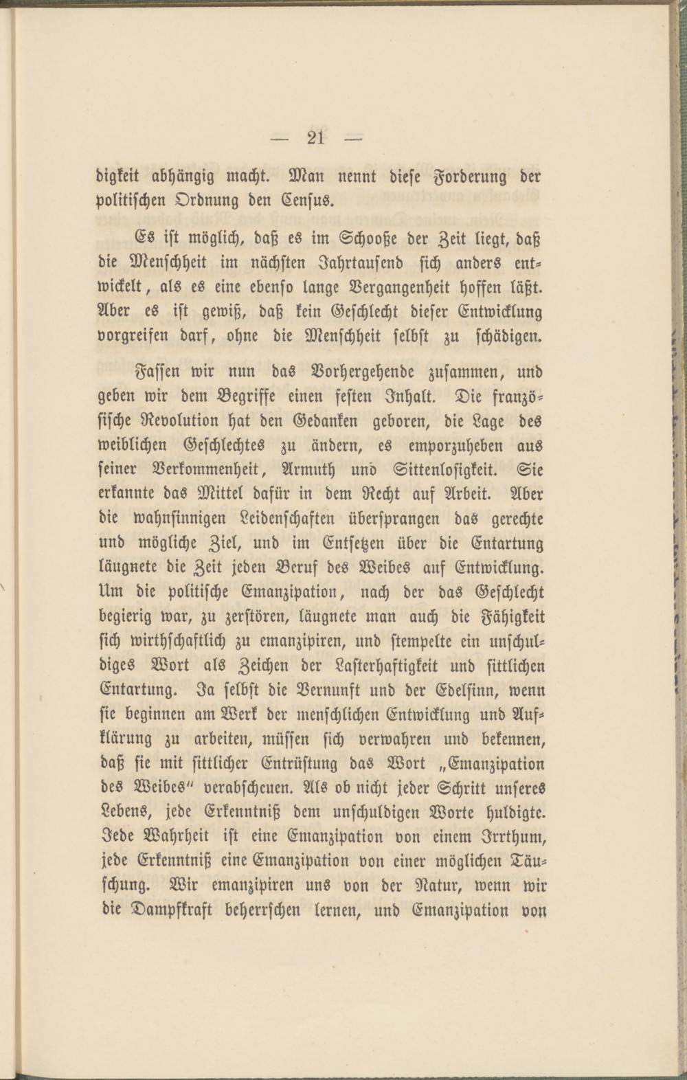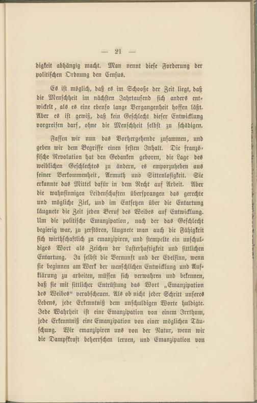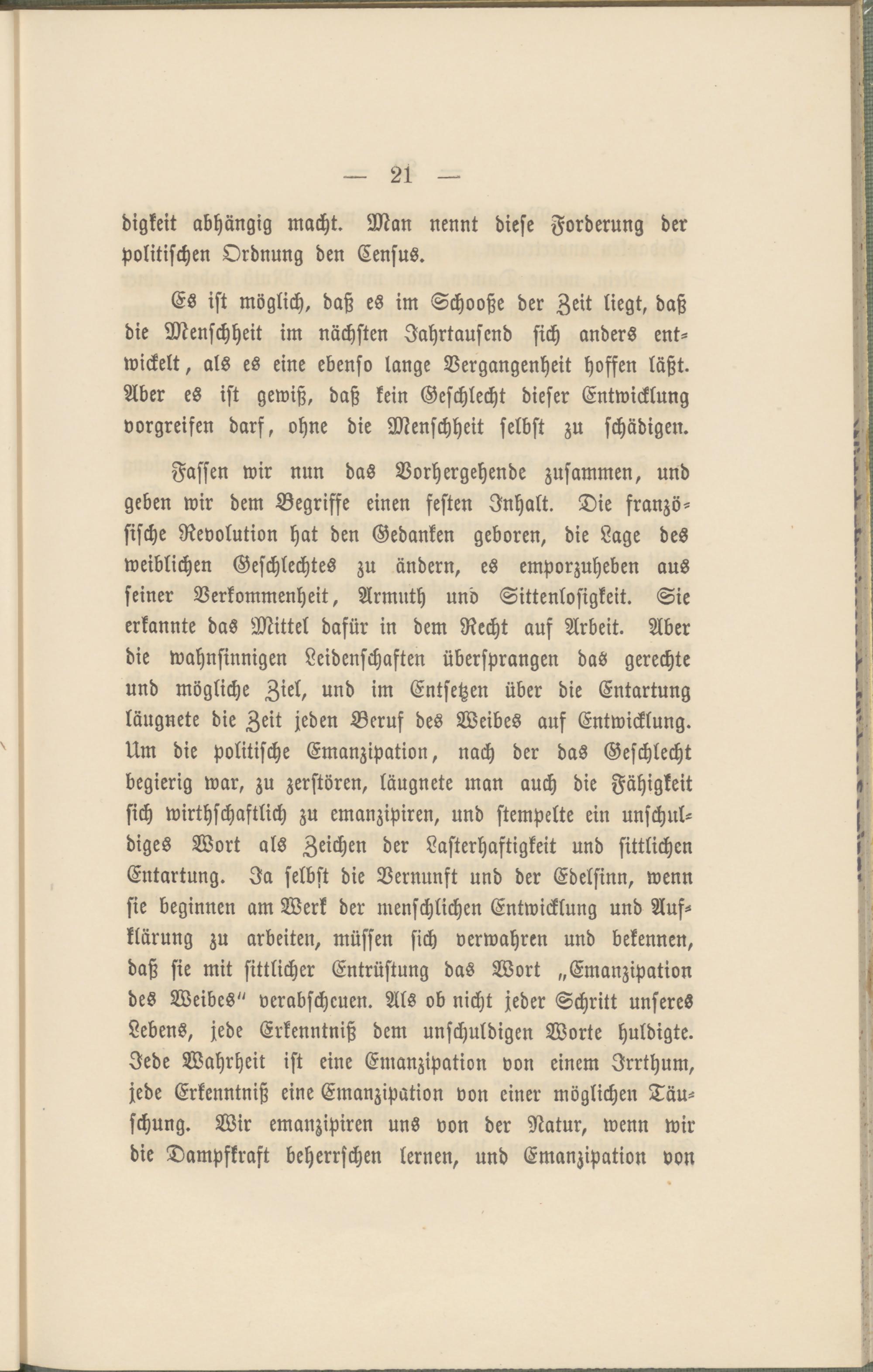 Fassen wir nun das Vorhergehende zusammen, und geben wir dem Begriffe einen festen Inhalt. Die französische Revolution hat den Gedanken geboren, die Lage des weiblichen Geschlechtes zu ändern, es emporzuheben aus seiner Verkommenheit, Armuth und Sittenlosigkeit. Sie erkannte das Mittel dafür in dem Recht auf Arbeit. Aber die wahnsinnigen Leidenschaften übersprangen das gerechte und mögliche Ziel, und im Entsetzen über die Entartung läugnete die Zeit jeden Beruf des Weibes auf Entwicklung. Um die politische Emanzipation, nach der das Geschlecht begierig war, zu zerstören, läugnete man auch die Fähigkeit sich wirtschaftlich zu emanzipiren, und stempelte ein unschuldiges Wort als Zeichen der Lasterhaftigkeit und sittlichen Entartung. Ja selbst die Vernunft und der Edelsinn, wenn sie beginnen am Werk der menschlichen Entwicklung und Aufklärung zu arbeiten, müssen sich verwahren und bekennen, daß sie mit sittlicher Entrüstung das Wort „Emanzipation des Weibes" verabscheuen. Als ob nicht jeder Schritt unseres Lebens, jede Erkenntniß dem unschuldigen Worte huldigte. Jede Wahrheit ist eine Emanzipation von einem Irrthum, jede Erkenntniß eine Emanzipation von einer möglichen Täuschung. Wir emanzipiren uns von der Natur, wenn wir die Dampfkraft beherrschen lernen, und Emanzipation von