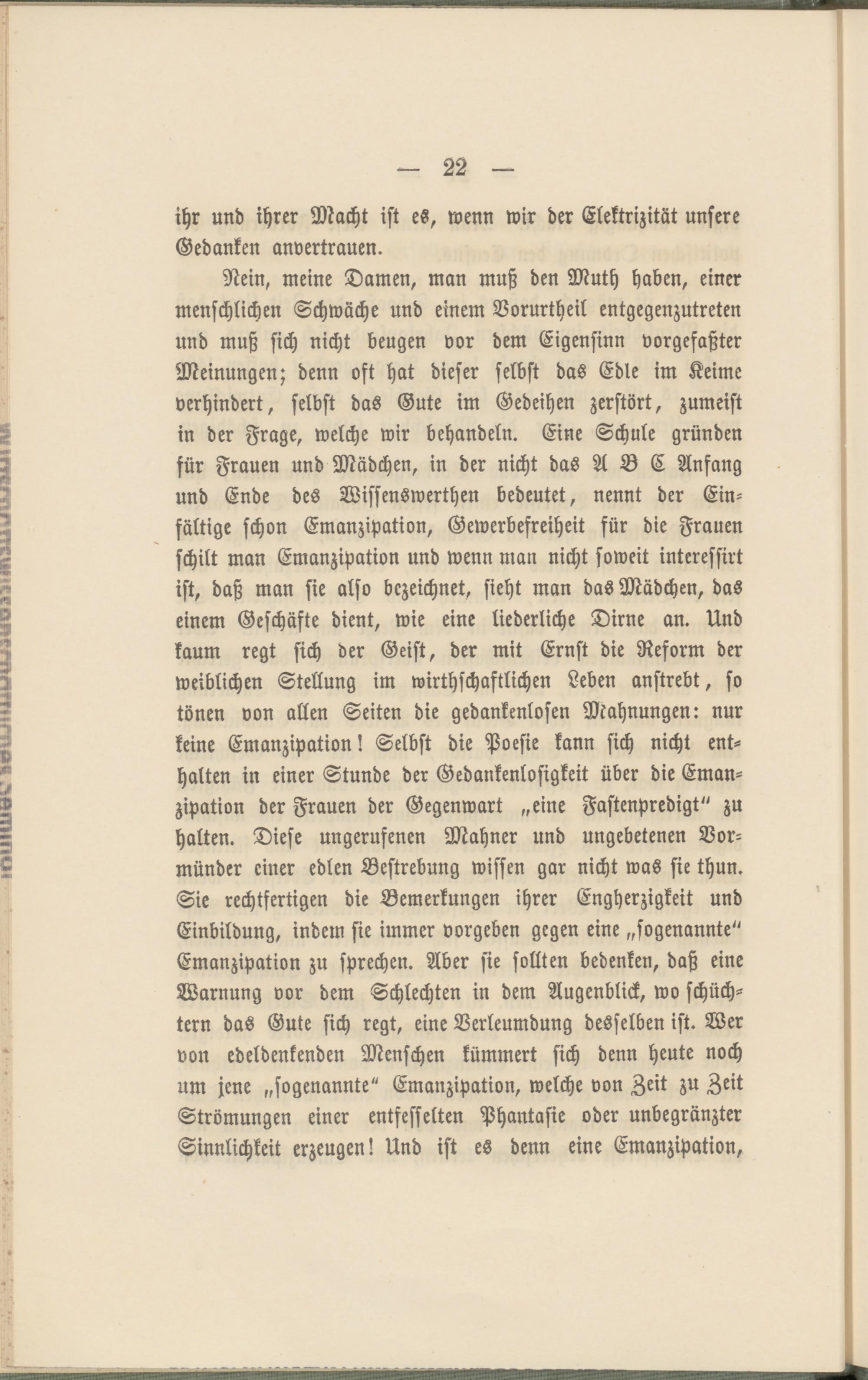 Nein, meine Damen, man muß den Muth haben, einer menschlichen Schwäche und einem Vorurtheil entgegenzutreten und muß sich nicht beugen vor dem Eigensinn vorgefaßter Meinungen; denn oft hat dieser selbst das Edle im Keime verhindert, selbst das Gute im Gedeihen zerstört, zumeist in der Frage, welche wir behandeln. Eine Schule gründen für Frauen und Mädchen, in der nicht das A B C Anfang und Ende des Wissenswerthen bedeutet, nennt der Einfältige schon Emanzipation, Gewerbesreiheit für die Frauen schilt man Emanzipation und wenn man nicht soweit interessirt ist, daß man sie also bezeichnet, sieht man das Mädchen, das einem Geschäfte dient, wie eine liederliche Dirne an. Und kaum regt sich der Geist, der mit Ernst die Reform der weiblichen Stellung im wirthschaftlichen Leben anstrebt, so tönen von allen Seiten die gedankenlosen Mahnungen: nur keine Emanzipation! Selbst die Poesie kann sich nicht enthalten in einer Stunde der Gedankenlosigkeit über die Emanzipation der Frauen der Gegenwart „eine Fastenpredigt" zu halten. Diese ungerufenen Mahner und ungebetenen Vormünder einer edlen Bestrebung wissen gar nicht was sie thun. Sie rechtfertigen die Bemerkungen ihrer Engherzigkeit und Einbildung, indem sie immer vorgeben gegen eine „sogenannte" Emanzipation zu sprechen. Aber sie sollten bedenken, daß eine Warnung vor dem Schlechten in dem Augenblick, wo schüchtern das Gute sich regt, eine Verleumdung desselben ist. Wer von edeldenkenden Menschen kümmert sich denn heute noch um jene „sogenannte" Emanzipation, welche von Zeit zu Zeit Strömungen einer entfesselten Phantasie oder unbegränzter Sinnlichkeit erzeugen! Und ist es denn eine Emanzipation,